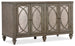 A glamorous and romantic piece for any space ranging from office to living room to entry, the Rustic Glam Credenza is crafted of Quartered White Oak Veneers with shimmery eglomise accents and features four wood-framed doors with softly rounded wood fretwork over the glass. One tray drawer is featured as well as one locking file drawer with pendaflex system behind the right side pair of doors.