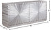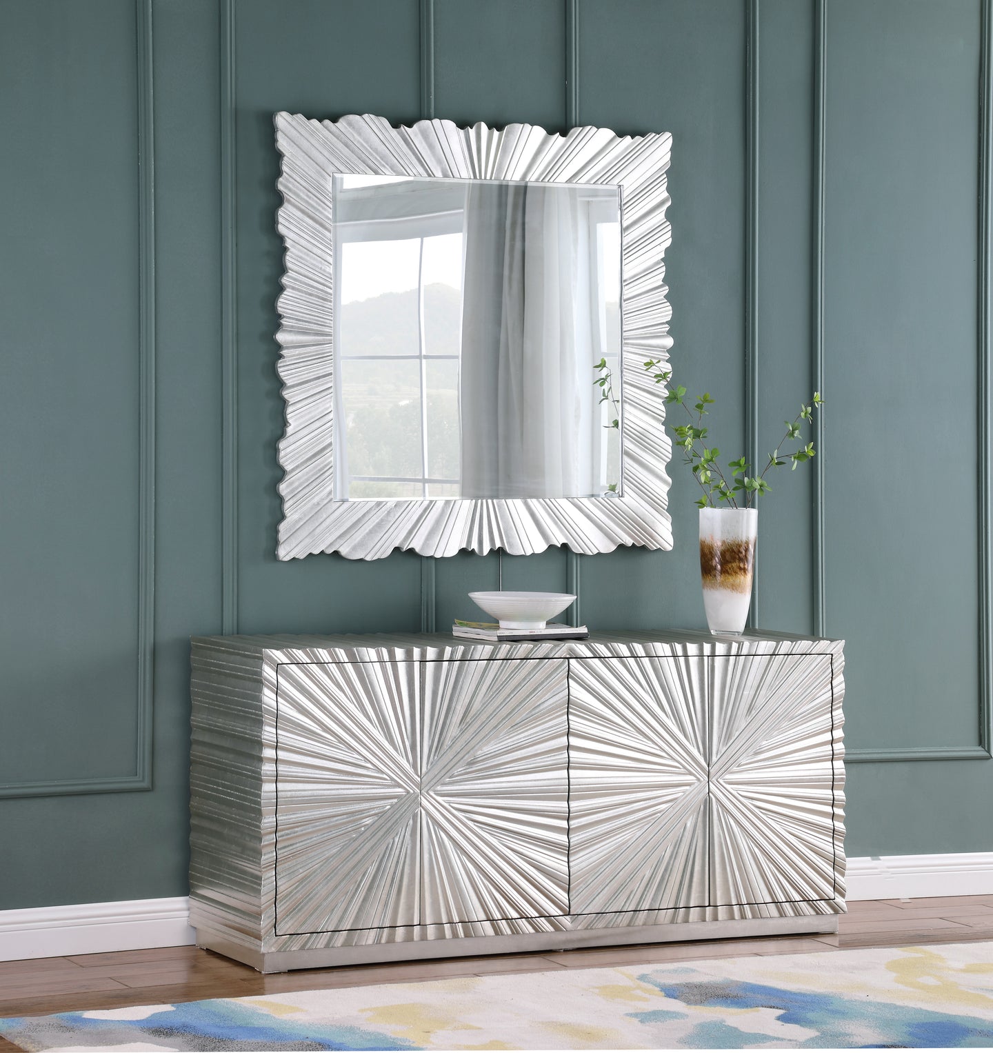 Keep the things you use most handily nearby inside this Silverton sideboard. This lovely sideboard/buffet is just the thing to bring organizational power to your dining area. Open its doors to reveal a shelf area for neatly stacking everything from dining room linens like tablecloths and napkins to out-of-season dinnerware or serving pieces. An all-over silver leaf finish adds an elegant touch to the buffet, and its hand-carved sunburst details add a refined finish.