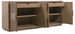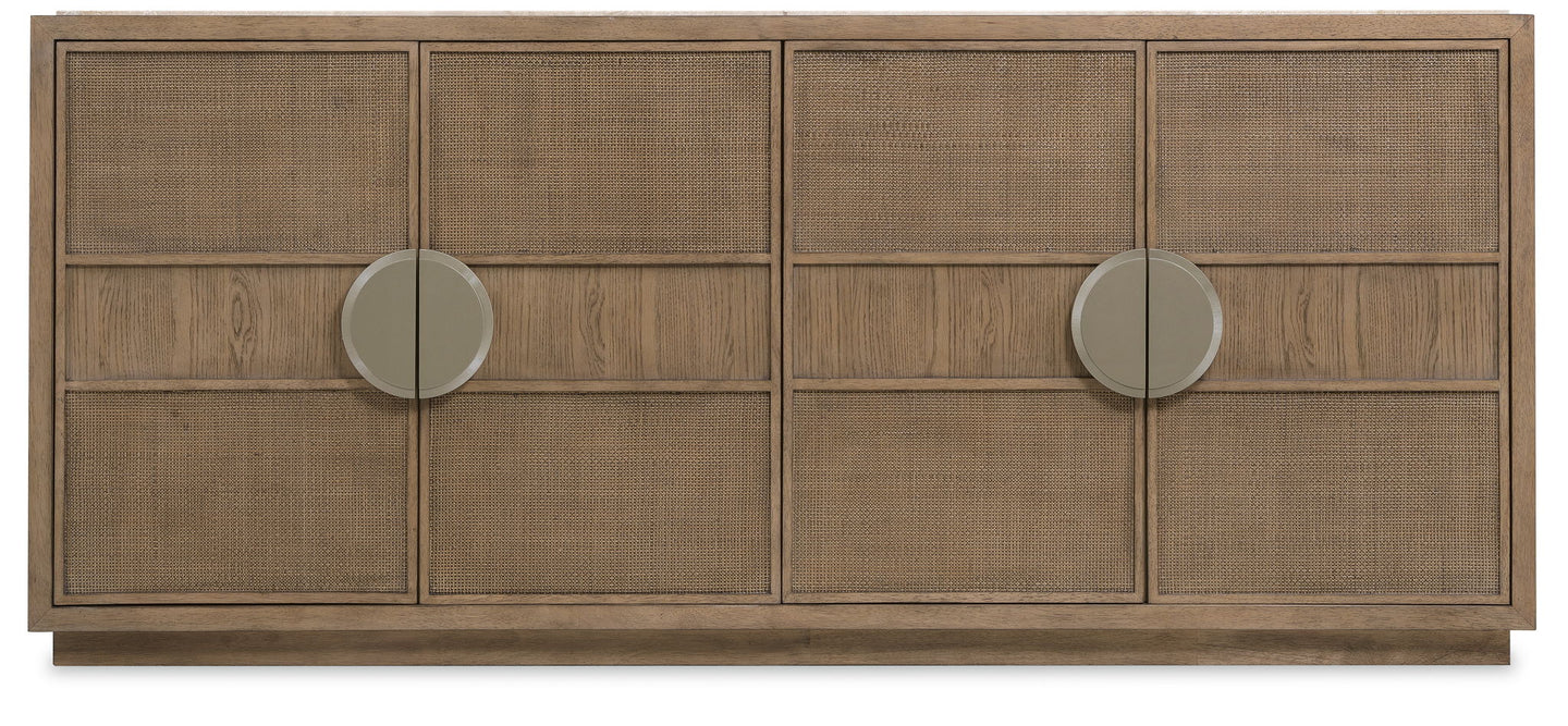 Blending organic textures and neutral tones with a refined minimalist silhouette, the stylistically versatile Sonnet Dining Credenza exudes a natural luxury. The four cane-front doors are soft close with magnetic catches, and the left pair of doors has one drawer with a removable cream-colored felt silverware tray. The right pair of doors has one drawer with a drop-in felt liner. There’s one adjustable/reversible wood shelf with wine storage option that holds up to 9 bottles in each pair of doors. The marble inset top combines cream, beige and brown colorations. The frame is crafted of Quartered and Cathedral-Cut White Oak Veneers in a light earthen-toned finish. Satin-finished large semi-circle pulls add a swanky accent.