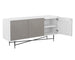 Elevate any living or dining room space with this geometric sideboard that boasts a rich amount of detail. Features grey solid mango wood cabinet fronts and stylishly complemented with a white metal frame. Completed with a black powder coated hammered metal base. Also available in a small version. Made in India. With refined craftsmanship, this design was brought to life by skilled local artisans. By nature, these materials develop unique imperfections such as fissures, markings and colour variations for a truly one-of-a-kind piece.