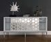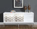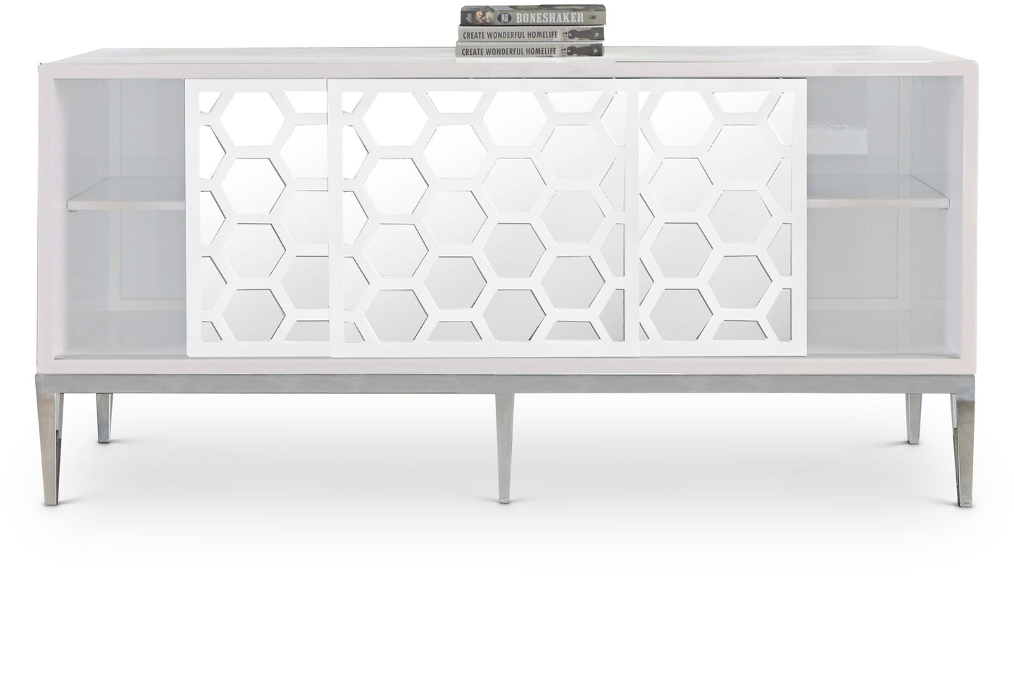 Rely on this Zoey Sideboard Buffet from Meridian Furniture to keep your dining room neat and tidy. The modish design features a richly lacquered white surface with honeycomb mirror inserts all nesting on the stainless steel legs. Slide the doors over to reveal roomy space for storing serving dishes and dinnerware within easy reach. Make use of the open shelving for displaying items or additional storage.