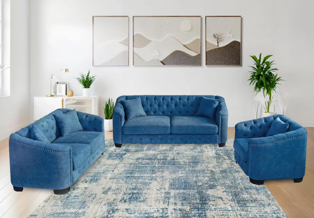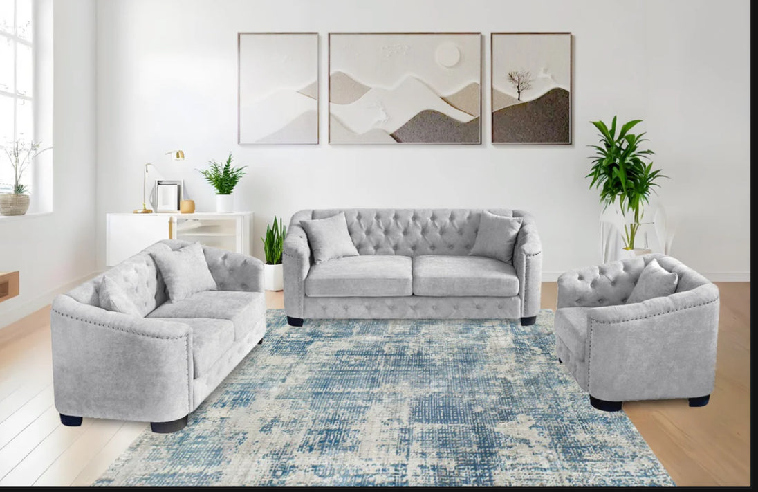 Transform your living room into a stylish retreat with this elegant 3-piece sofa set, expertly crafted for both comfort and durability. Wrapped in a plush, high-quality fabric that’s soft to the touch, this set includes a spacious sofa, a cozy loveseat, and a stylish armchair—perfect for entertaining guests or unwinding after a long day. The timeless tufted back design adds a touch of sophistication, while five matching accent pillows provide extra support and a cohesive look.