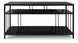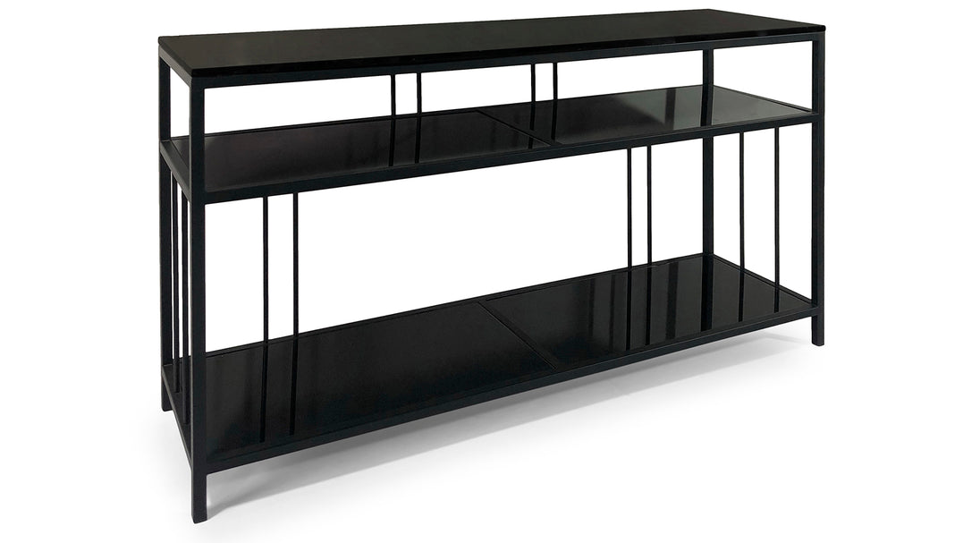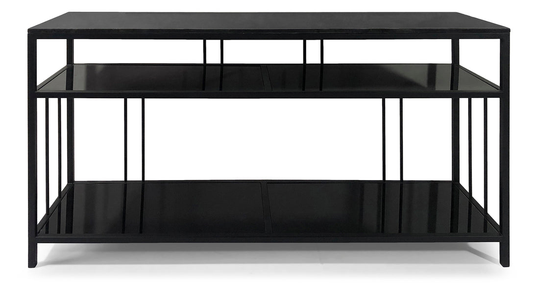 A modern console table featuring a black marble top and sleek black glass shelves. Supported by a sturdy metal frame in a black powder-coated finish, this piece blends sophistication with functionality—perfect for hallways, living rooms, or offices.