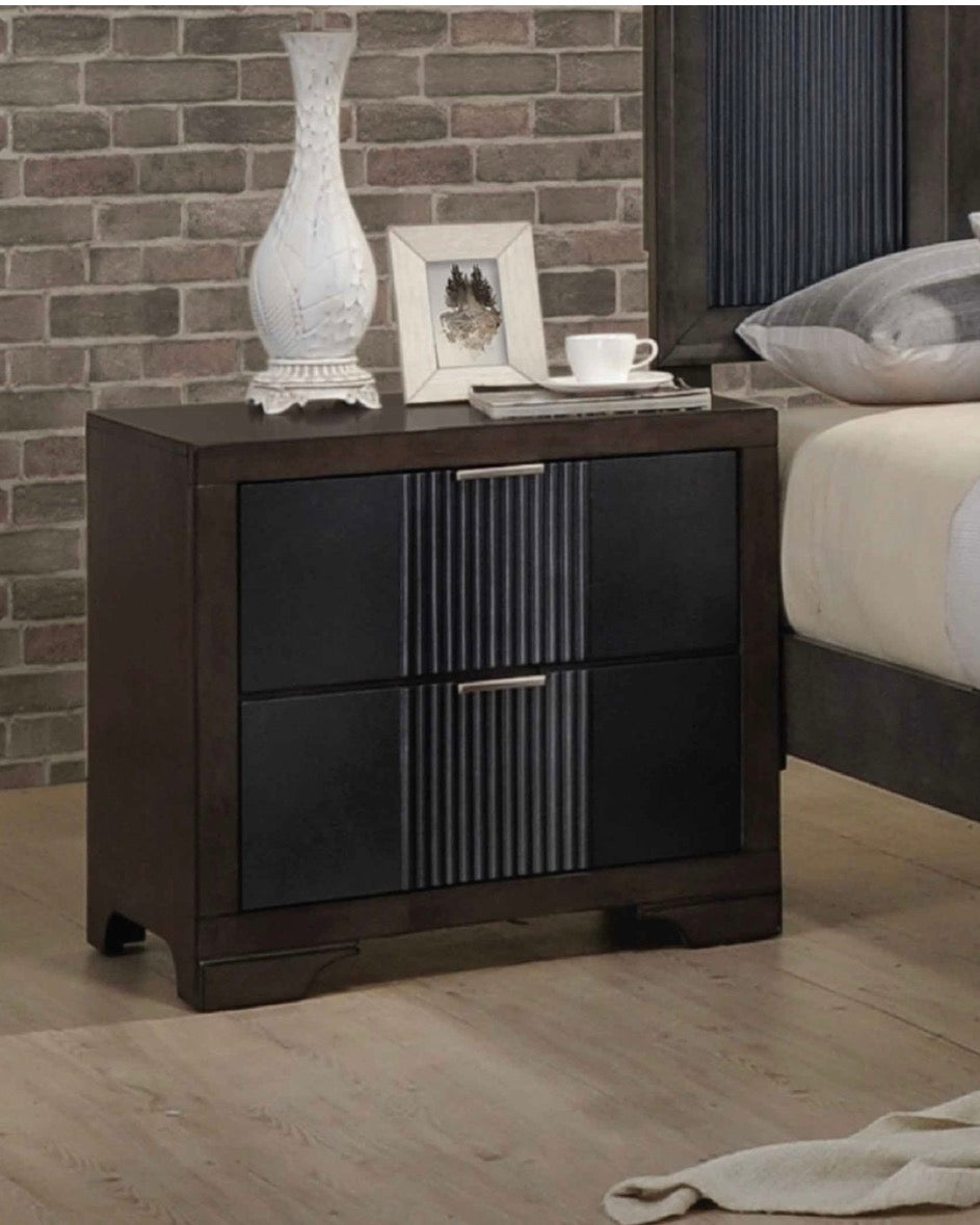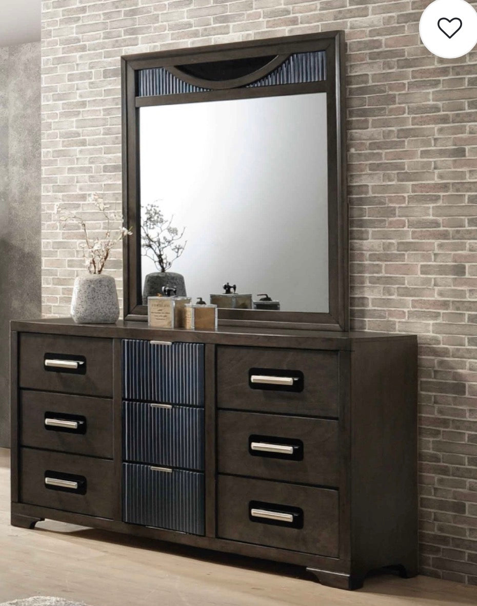 The commanding headboard showcases graceful curved detailing paired with vertical textured inlays, while matching pieces echo the same signature craftsmanship. Spacious storage in the dresser, chest, and nightstand give you functionality without compromising beauty — sleek metal pulls and smooth drawer action make organization effortless.