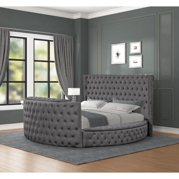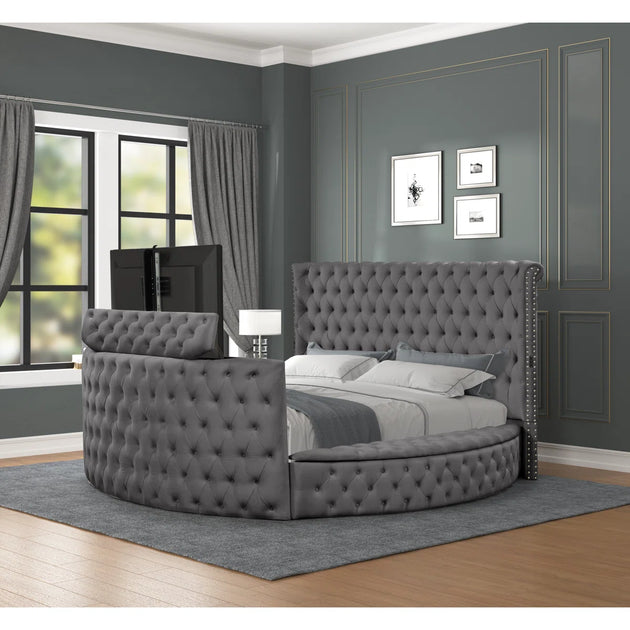 Jenn Grey Fabric Platform Bed w/ Wired Storage Drawer