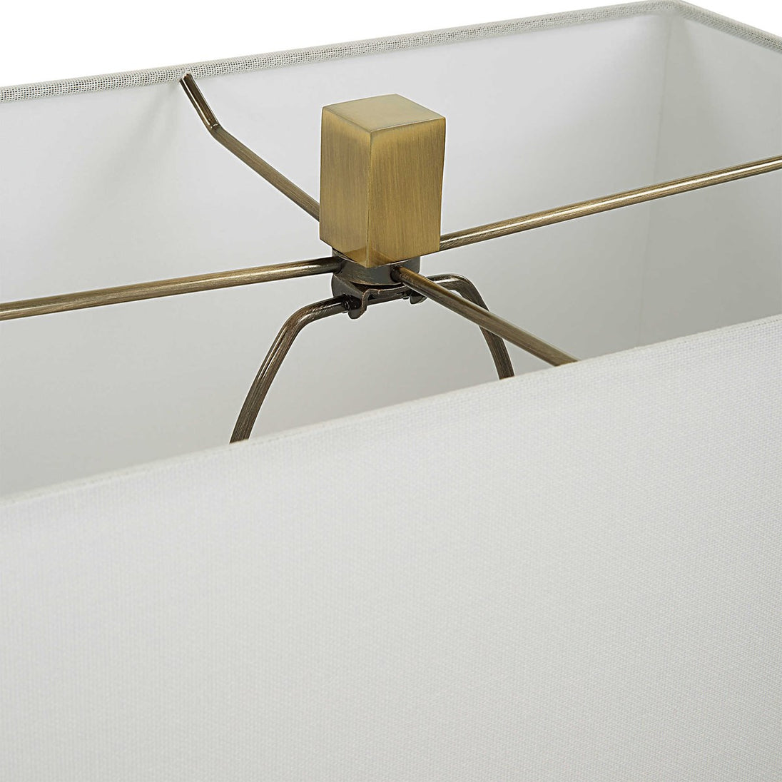 Contemporary in design yet elegant in style, this table lamp features a tapered iron base finish in a plated antique brass topped with a thick crystal ornament. The rectangle hardback shade is a crisp white linen fabric.