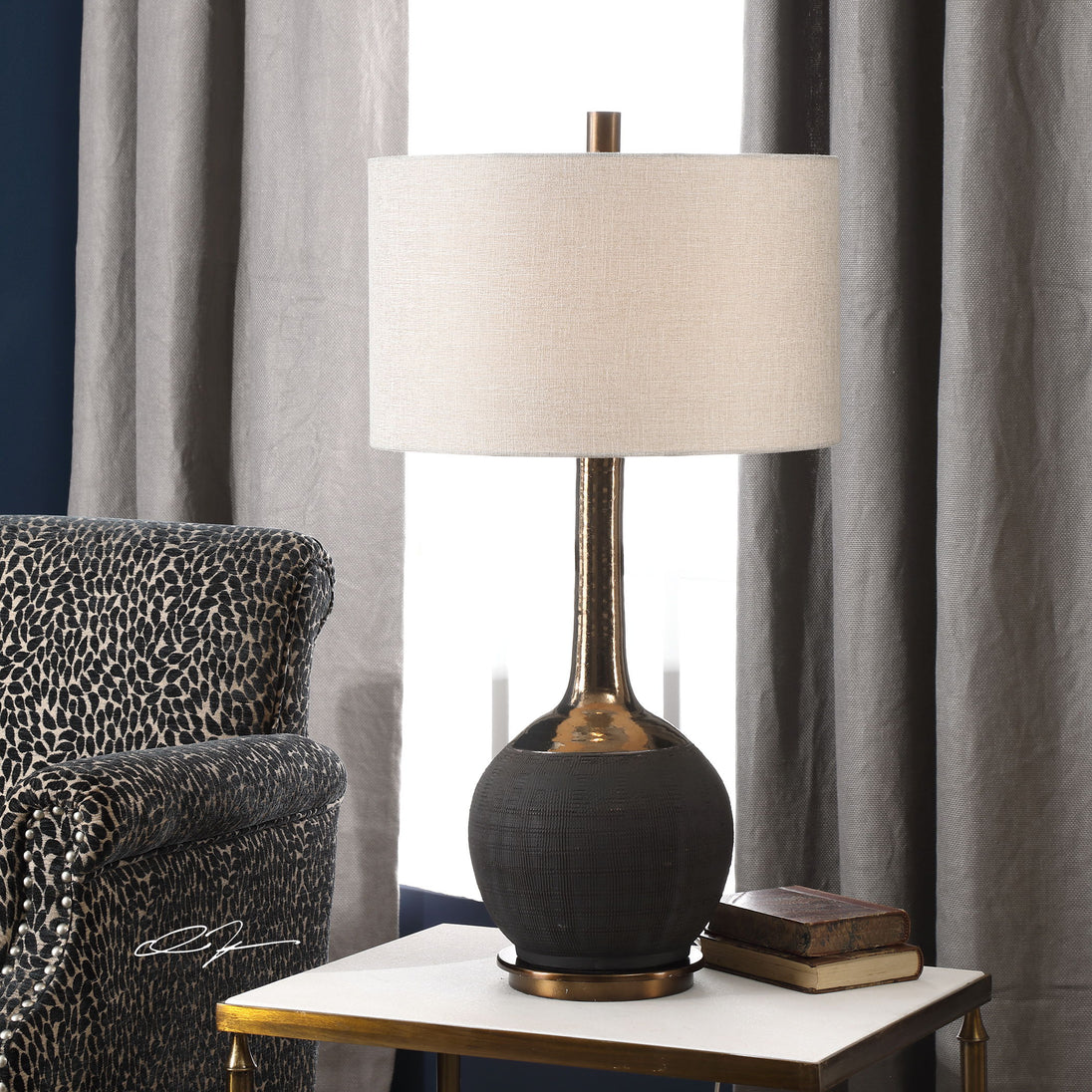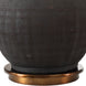 This Ceramic Base Features A Textured, Matte Black Hand-scored Body, Accented With A Metallic Golden Bronze Glazed Neck. The Round Hardback Drum Shade Is A Light Gray Linen Fabric.Product Features