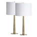 Suitable for mid-century modern, contemporary or glamorous classic interiors, this set of table table lamps requires no additional accessories to elevate a space. Constructed of iron with an antique brushed brass finish, these table lamps radiate warmth while maintaining a sleek sophistication. The unique structure adds an unexpected quality to this design and makes it equally suitable for cozy and streamlined spaces alike.