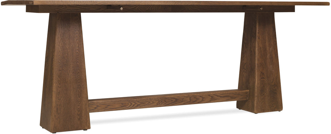 This console table features a flip-top design that doubles the tabletop width when opened, providing additional surface area or dining space. Its double pedestal base with stretcher and slender profile make it versatile for smaller spaces.