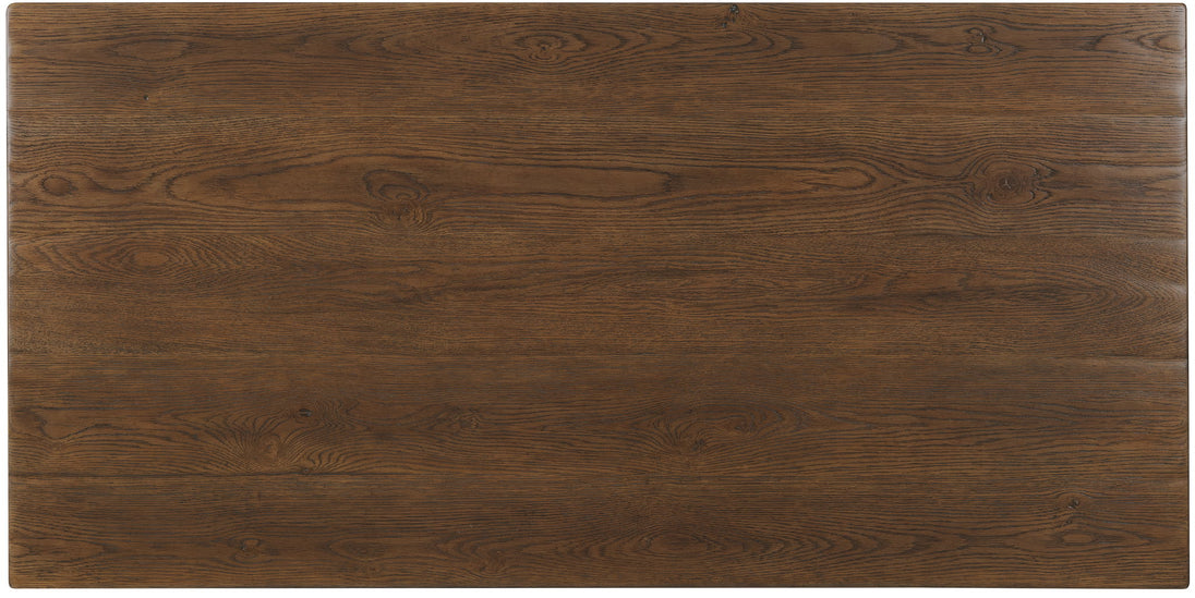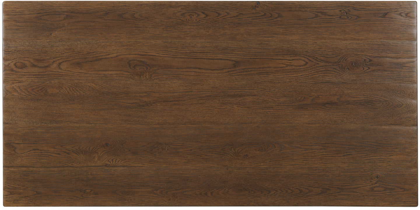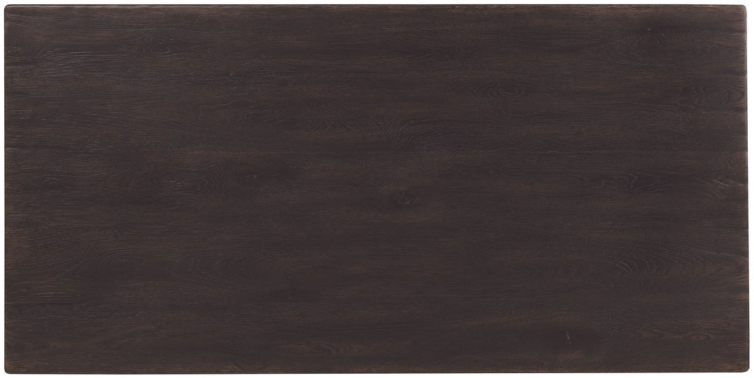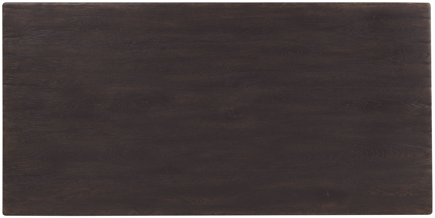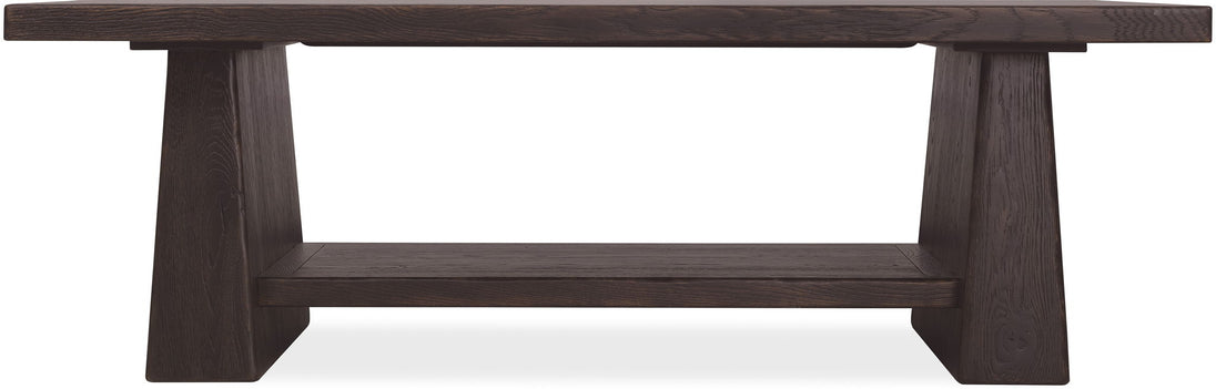 The finish gives this rectangular cocktail table a dramatic character. With its double pedestal base and sturdy fixed shelf, it blends rustic sophistication with modern function, perfect for a design-conscious living space.