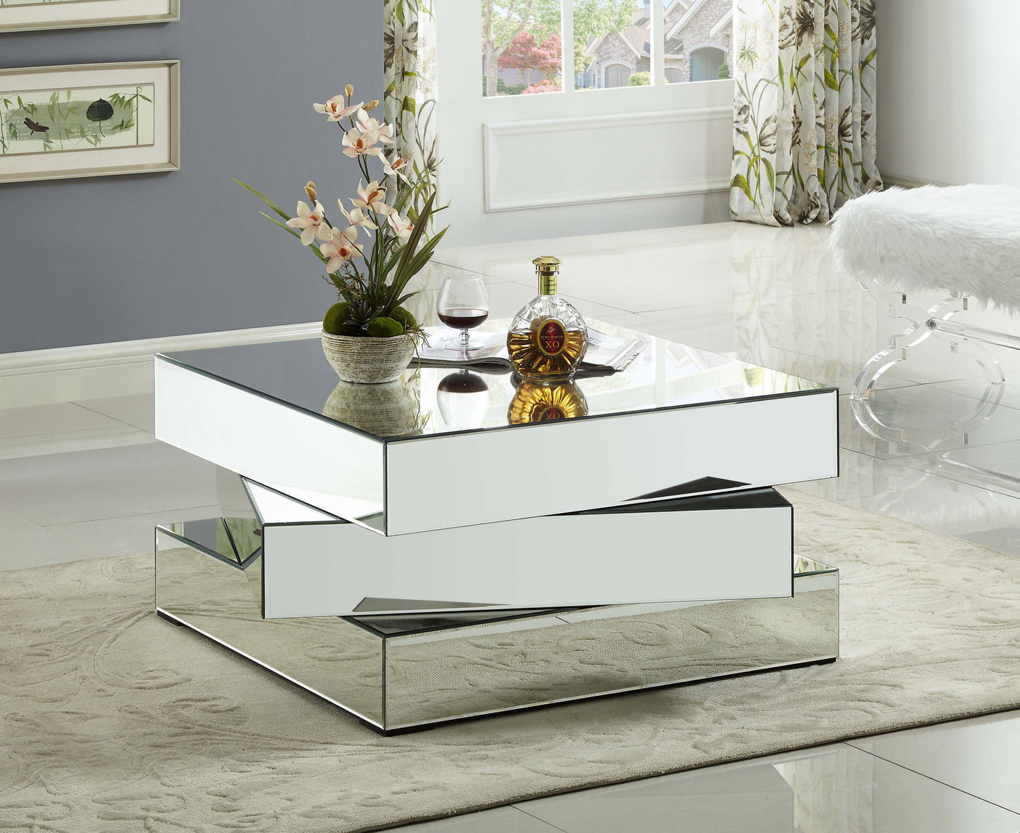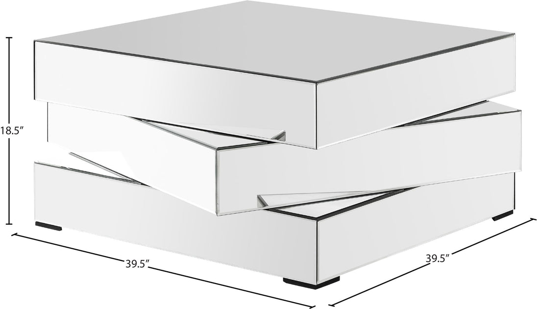 Bring home this Haven coffee table to add a distinctly modern look to your living room or den. This eye-grabbing table from Meridian Furniture features a triple-stacked platform design in a square shape for a geometric look that's more like a piece of fine sculpture than the true utilitarian item it truly is. The surfaces of the table are mirrored, adding a light, airy touch to your space and giving it a beautiful aesthetic in contemporary decor.