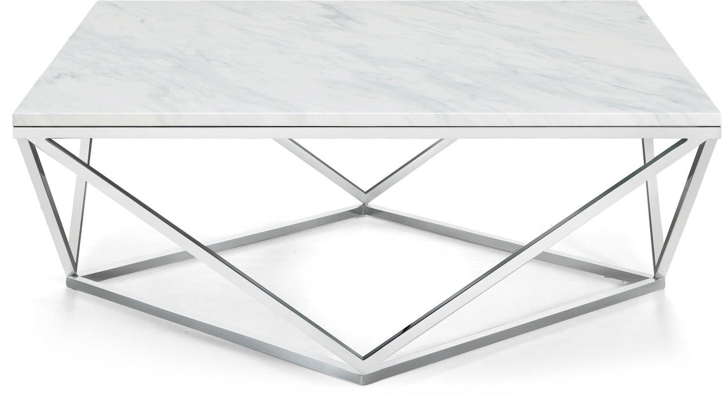 Keep the modern vibe going with this Skyler stainless steel coffee table from Meridian Furniture. This table features architectural bases with a sculptural design that's chic and contemporary. The tops of each table feature solid stone tops for durability and remarkable style.
