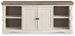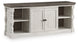 Set your sights on modern farmhouse style with this XL TV stand. Distressed two-tone treatment blends a weathered gray with vintage white for an utterly charming effect. Turned posts lend a hearty, substantial look that feels right at home, while plenty of open shelving makes the aesthetic anything but heavy.