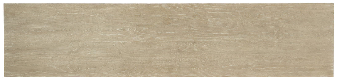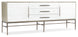 Couture and chic, the Cascade Entertainment Console combines a slender and graceful silhouette with a two-tone finish in a serene color palette of whites, creams and taupe. The outside of the case is crafted of Oak Veneers in the soft taupe Terrain finish with dry brushing, while the door and drawer fronts are in a chalk-colored cast resin, accented by champagne-colored bar pull hardware and a metal base. The two doors have soft-close hinges and one adjustable shelf behind each door. There’s a ventilated back panel and an power supply. Three drawers.