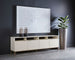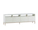 Crafted in Indonesia, this beautiful media console and cabinet will bring modern style and elegance to living, lounge and home office spaces. Designed with cream finished oak wood and a champagne gold iron frame. Features four cabinets for added style and function. Coordinate with the Ambrose modular wall desk, and large and small bookcases for a space saving design. As wood is an organic, porous material, these pieces will contain natural variation of texture and may also exhibit fine indentations and cracks. Wood pieces will also display a disparity of colour and grain, and visible knots and burls that add to the character of each piece.