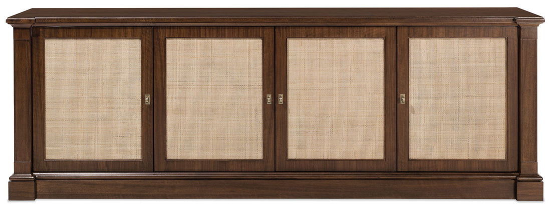 The Archives Entertainment Console brings a sophisticated blend of materials and finishes to your home entertainment space. Featuring four woven-cane panel doors and adjustable shelving, this console is designed to accommodate an 80" flat-screen TV, offering style and functionality. The high-clarity Classic Walnut finish over walnut veneers adds warmth and richness, while the ventilated back panel ensures your electronics stay cool. Ideal for those seeking a luxurious, yet practical piece to enhance their living room.