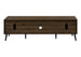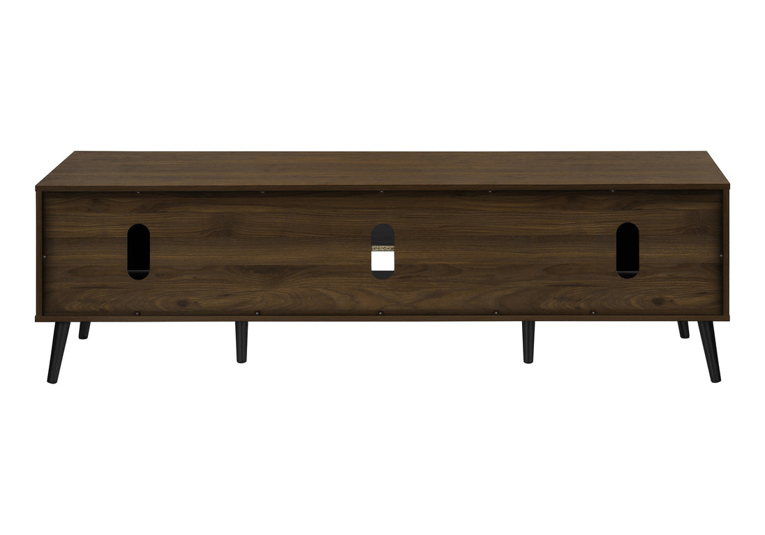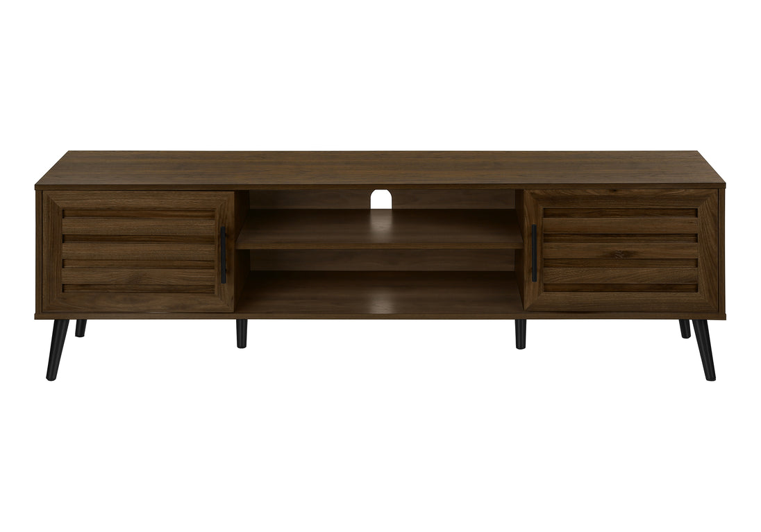 Upgrade your home entertainment with this stylish and functional 72 inch tv stand console in a warm wood-look brown laminate finish. It is durably designed with two closed cabinets with sleek black metal handles and a fixed open shelf with a wire management hole, providing ample storage space for all your media and entertainment needs. The slanted black solid wood legs provides stability for this transitional style tv console that will beautifully blend in with your existing decor. Easy to assemble, this media entertainment center includes all hardware and illustrated assembly instructions, and also comes with a 5 year limited warranty against manufacturer's defects. Add this fashionable tv stand to your living room or bedroom and create a look you'll love for years to come.