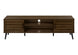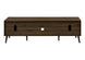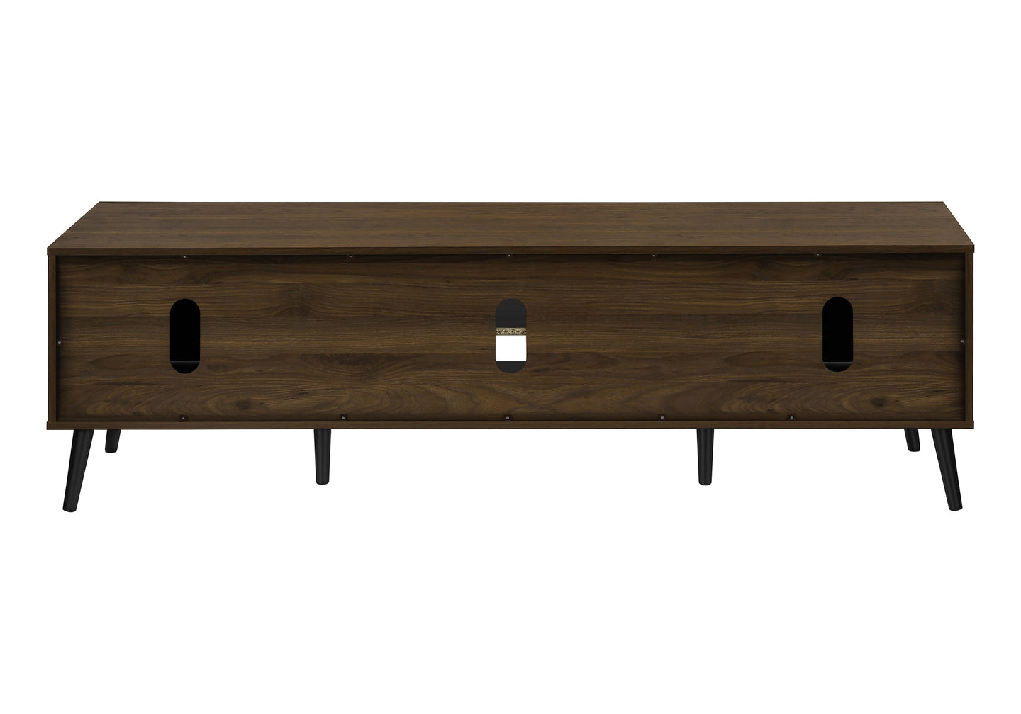 - This 72 inch transitional style tv stand in a rich brown laminate finish will suit any style of decor, while the slanted black wood legs add a discrete mid-century touch.
