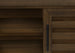 - Get plenty of storage space with 2 closed cabinets accented with sleek black metal handles, and 1 large wire management hole behind the fixed middle shelf - convenient for all your media and entertainment devices.