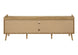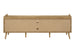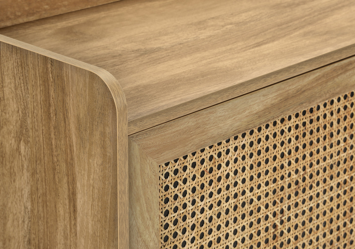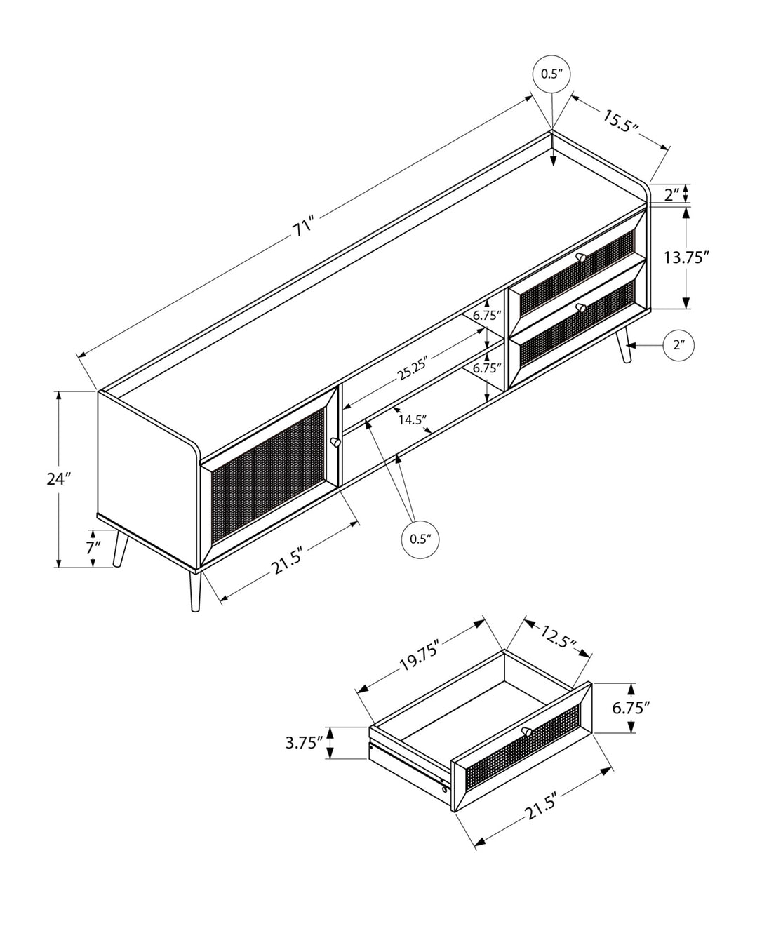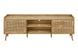 - This media entertainment center includes 1 closed storage cabinet and 2 drawers with elegant rattan paneling and wooden knobs, to store media accessories.