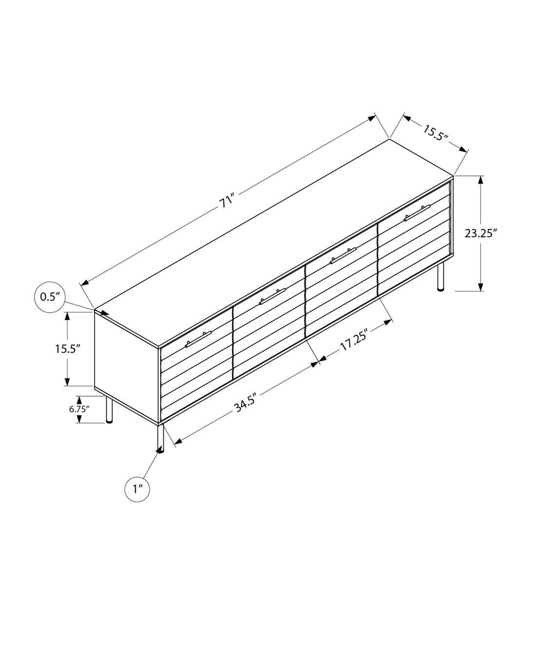- Trendy 72 inch tv stand in a dark brown laminate wood-look finish on all sides, with a fashionable style, mid-century rippled front design.