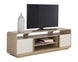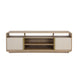 A classic media console and cabinet that offers a timeless and classic look with its soft, rounded edges. Crafted from light wash acacia wood with two cabinets wrapped in cream shagreen bonded leather. Completed with antique brass metal hardware.