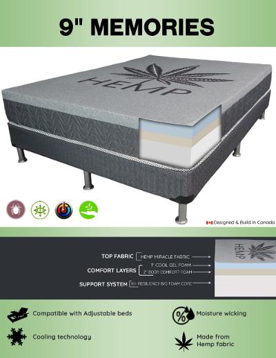 CannaBeds hemp mattresses are made with a blend of hemp fabric. Hemp is a natural fibre that helps regulate body temperature, uses no pesticides or herbicides, is hypoallergenic and so much more. The Memories is a cushion firm feel, firm feel but not hard.