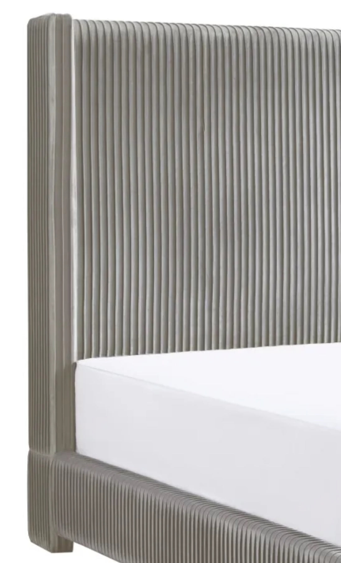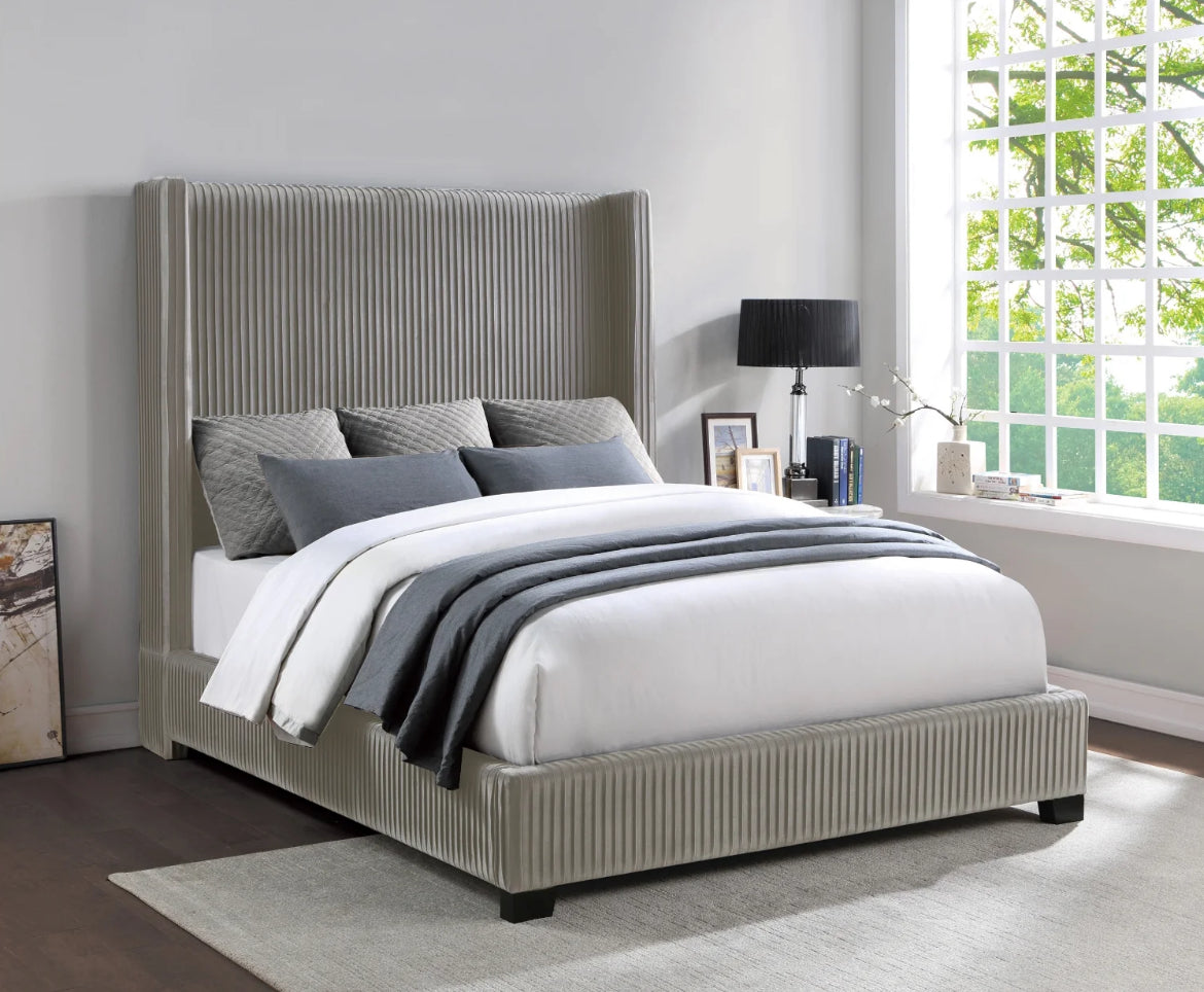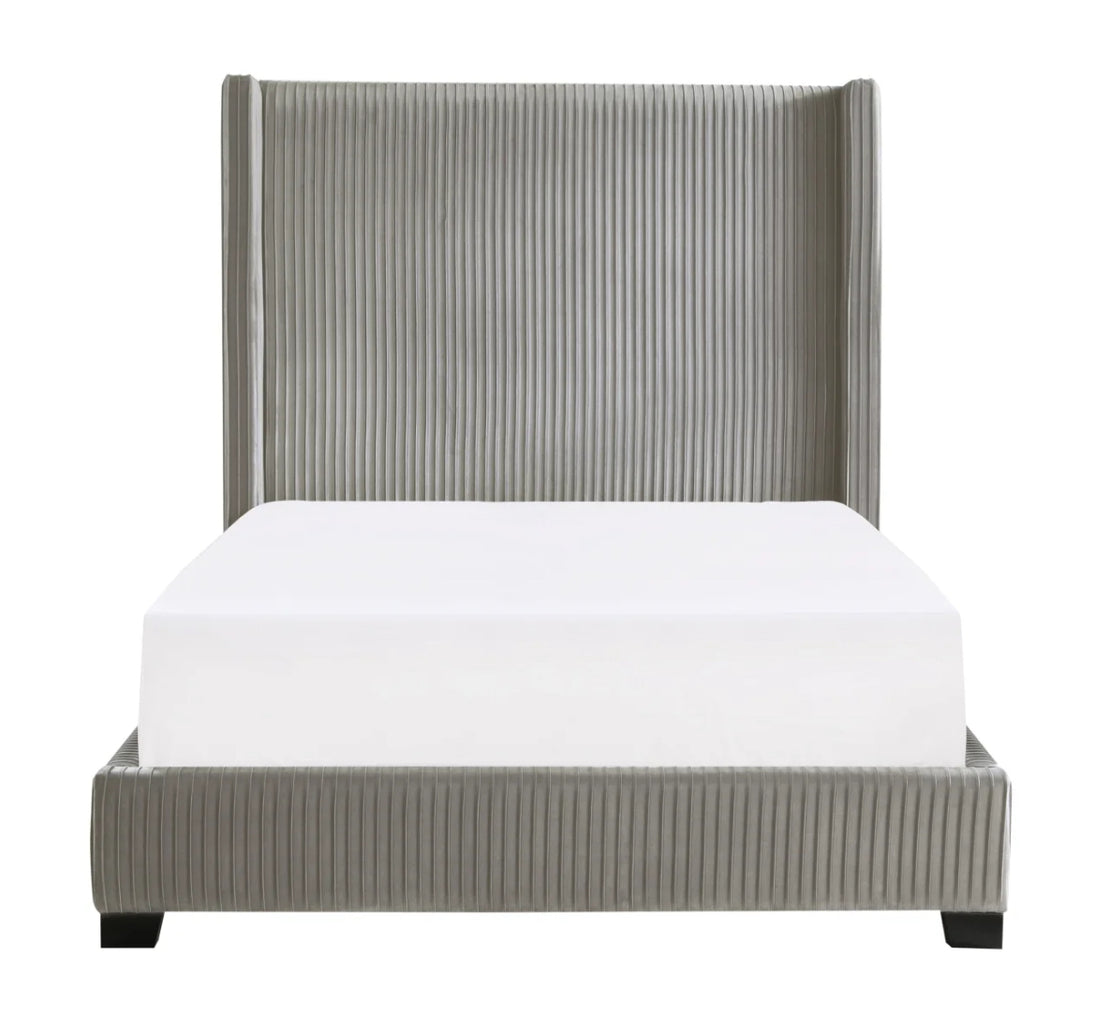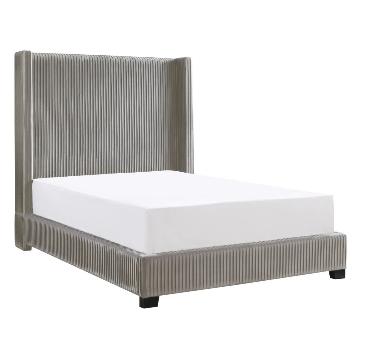 The stately profile of the Glanbury Collection will provide a dramatic statement to the design of your bedroom. The fully upholstered bed features pleated taupe velvet covering and mansion shelter headboard, creating a modern traditional look that defines your personal style.