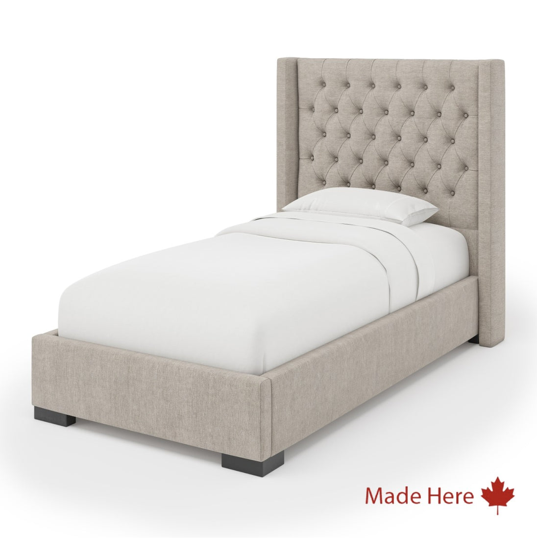 The Megara Bed - a harmonious blend of modern sophistication and classic charm. Featuring a striking tall, wingback headboard, which is meticulously crafted with deep diamond tufting. This design not only adds texture and depth but also creates an aura of elegance that draws the eye. The clean lines of the headboard are complemented by its gently curved wings, which provide a subtle nod to traditional design while maintaining a contemporary edge. The bed’s frame is sleek and minimalistic, providing a sturdy foundation without detracting from the headboard’s commanding presence.