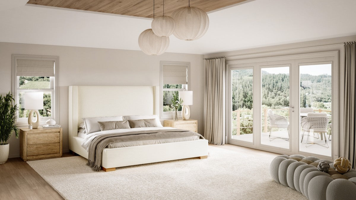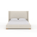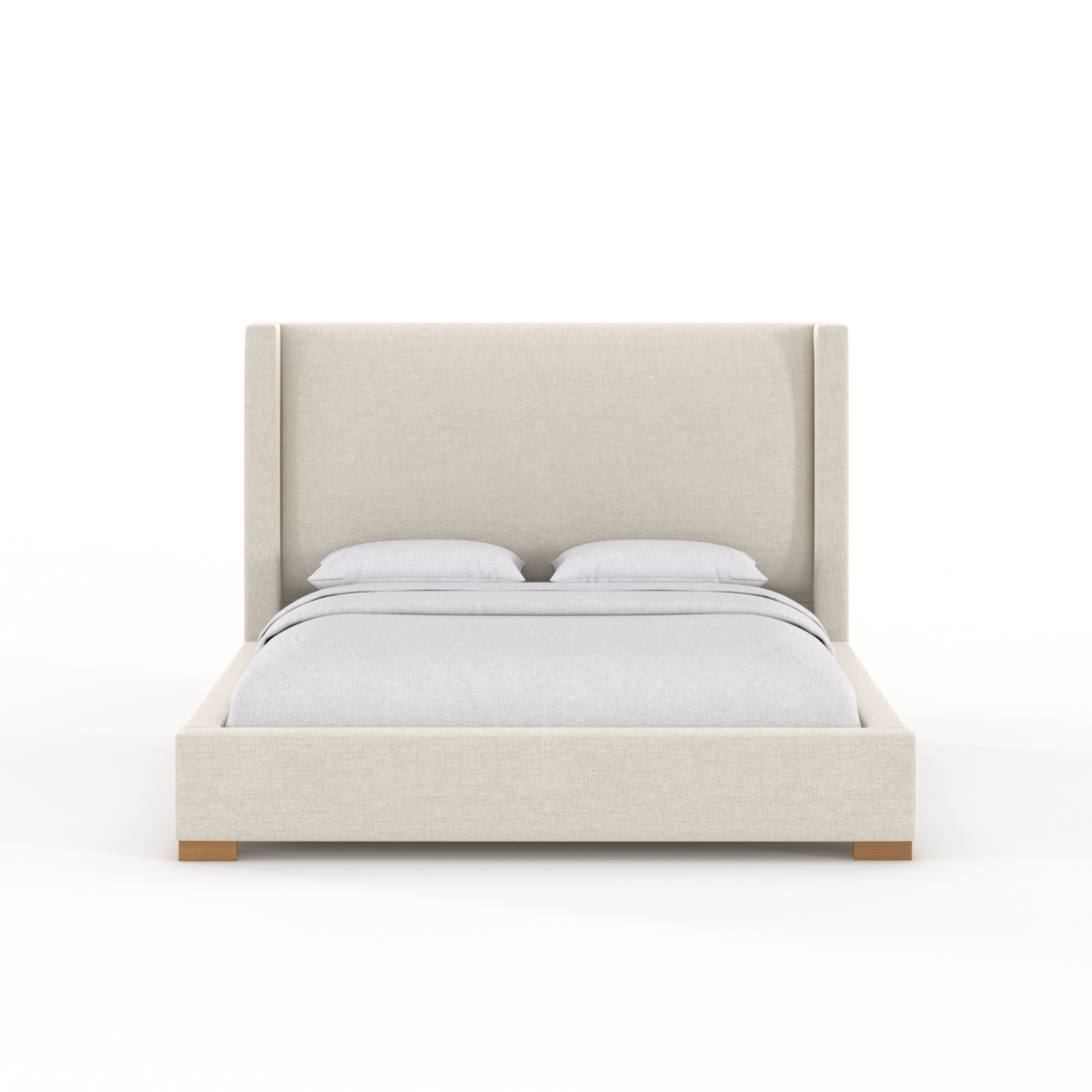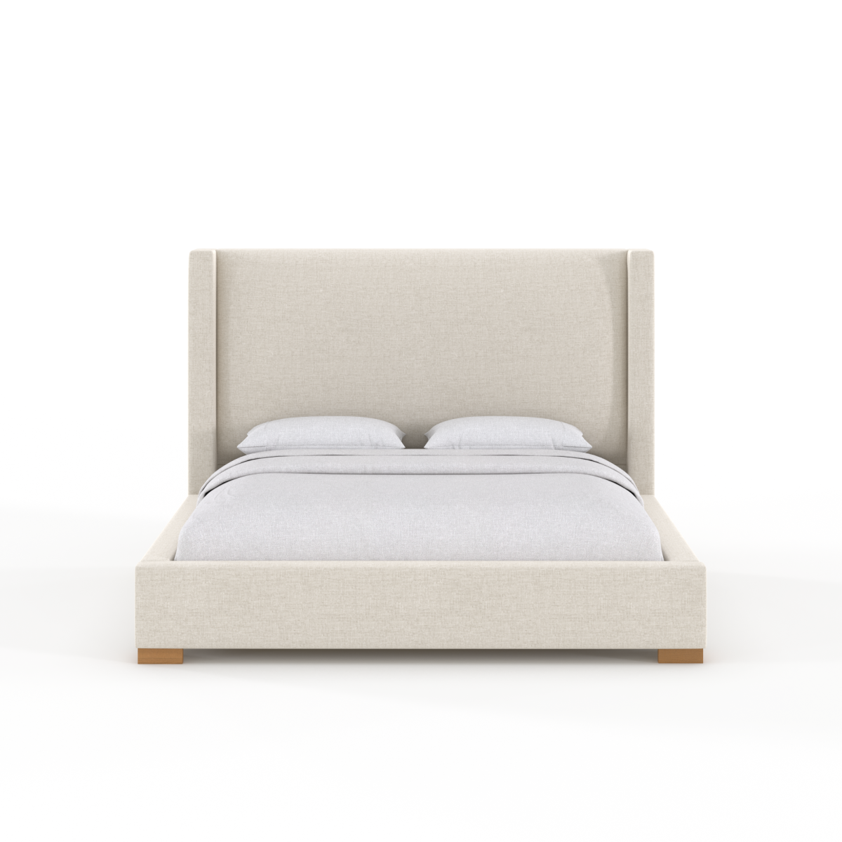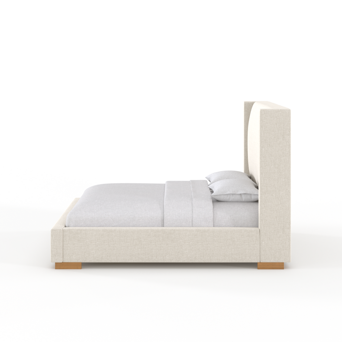 The Ulysses Bed, a perfect marriage of classic elegance and modern sophistication. This bed features a striking high-profile headboard with gently curved edges that create a soft, inviting silhouette. The headboard's design is both commanding and graceful, offering an ideal blend of comfort and style, whether you’re sitting up to read or simply relaxing. The corners of the frame are squared and crisp, which complements the bed’s overall geometric design. Every aspect of the Ulysses Bed’s exterior design is thoughtfully considered, from the harmonious blend of textures to the balance between boldness and subtlety. It’s a bed that doesn’t just occupy space but enhances it, serving as both a functional piece and a statement of refined taste.
