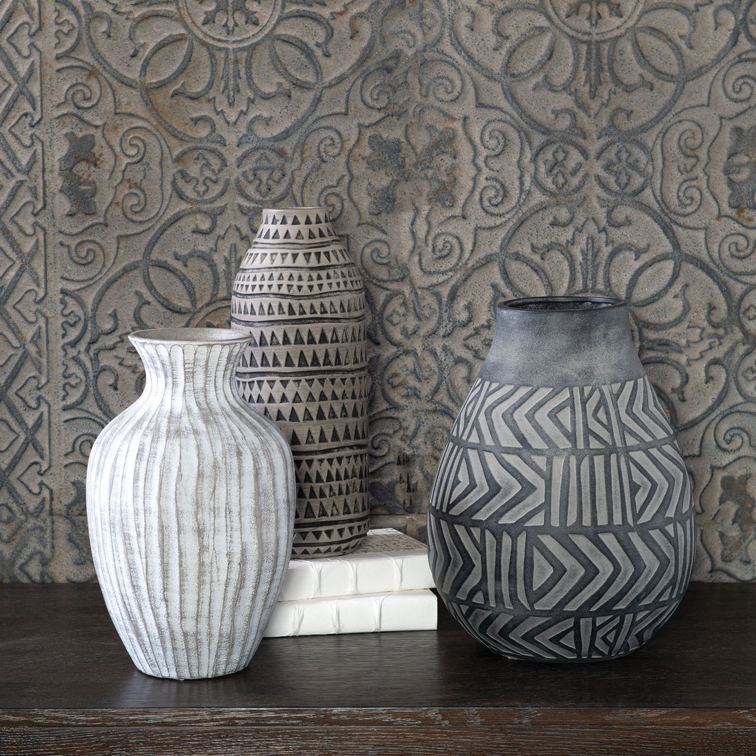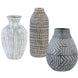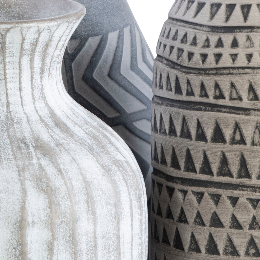 Set Of Three Earthenware Vases Are Finished In Light Gray, Charcoal And Natural Beige With Etched Geometric Patterns. Sizes: S-7x12x7, M-10x13x10, L-7x18x7Product Features