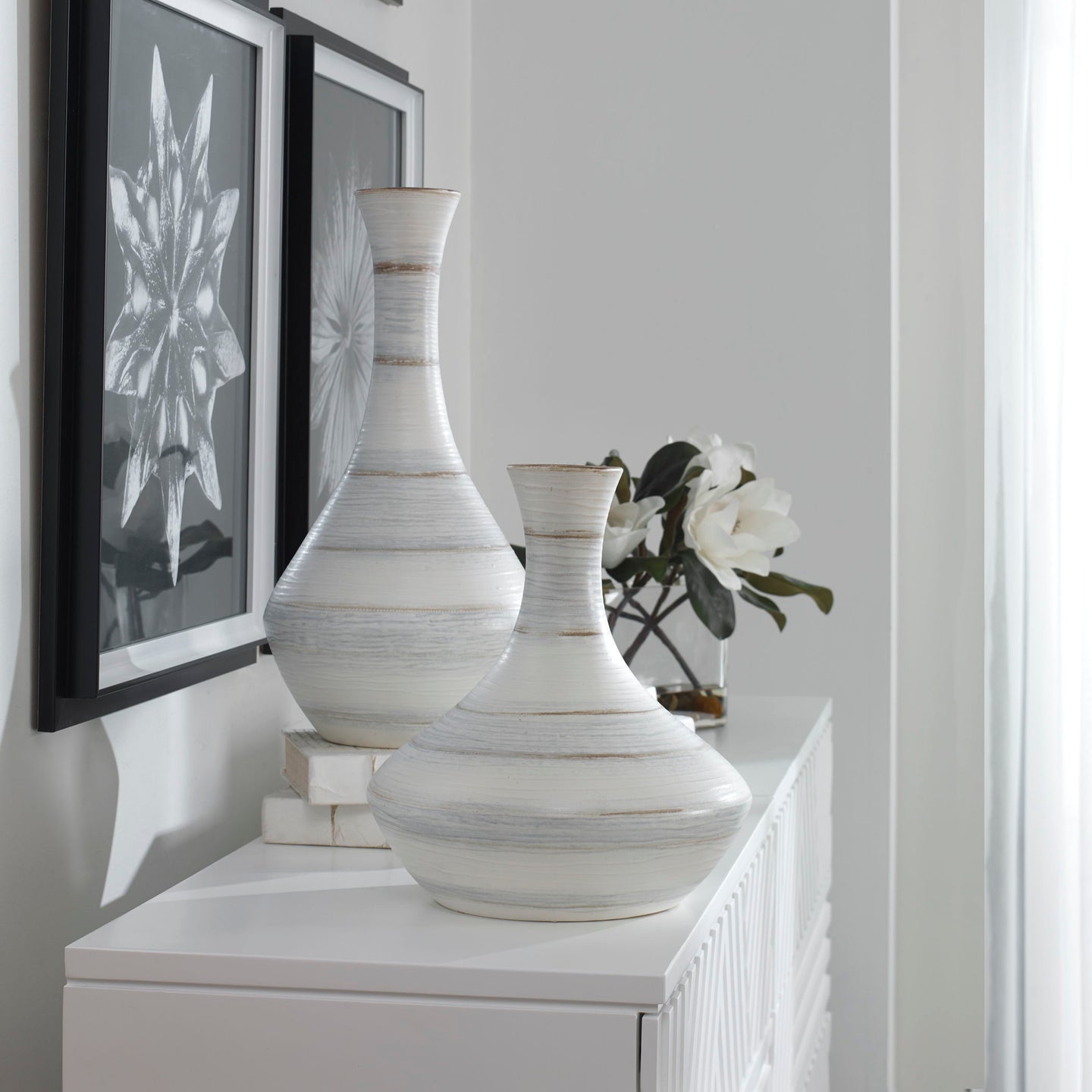 Handcrafted From Ceramic, These Fluted Vases Are Finished In Striped Soft Ivory, Blue, And Tan Glaze. Sizes: S-11x21x11, L-12x14x10.Product Features