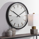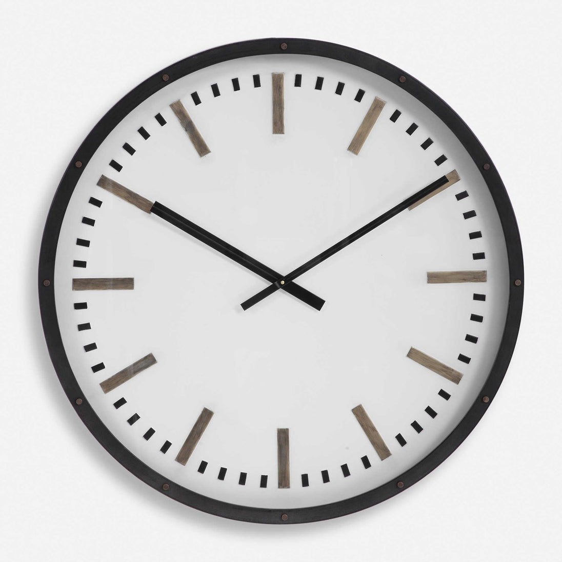 Wall clock featuring a dark bronze frame with nail head accents. The white, iron face with antique brass and black accents are encased under a glass. Quartz movement ensures accurate timekeeping. Requires one "AA" battery.