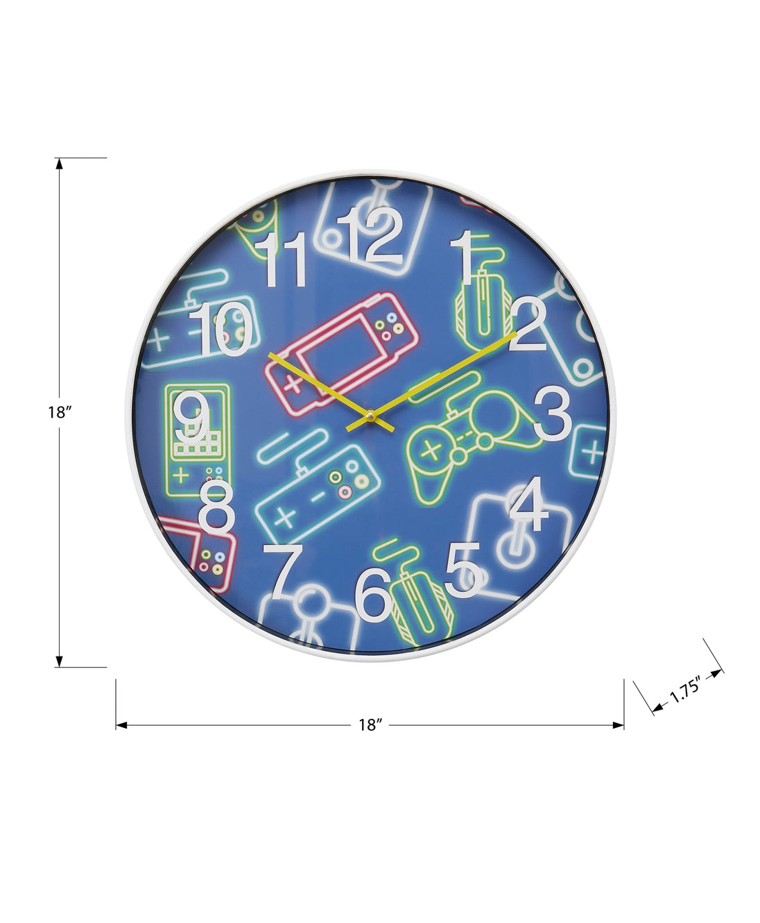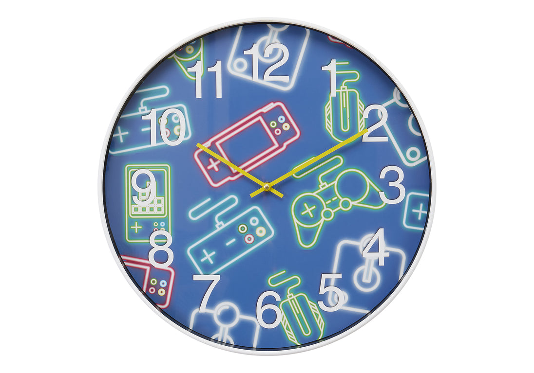 Introduce a splash of color and fun to your child's room with our vibrant 18" round wall clock! Designed for juvenile spaces, this contemporary analog clock combines modern aesthetics with practical functionality. Housed in a sleek white plastic frame and featuring a delightful multi-colored face, this clock is more than just a timepiece, it's a statement piece for home decor that sparkles with personality! With accurate timekeeping powered by quartz movement, your kids will never miss a beat. No assembly is needed, simply insert 1xAA battery (not included) and it's ready to go. The easy to read numerical display with a gaming printed motif under the glass surface add playful yet functional art. Plus, the non-ticking feature guarantees a peaceful environment during homework or bedtime, making it ideal for indoor use only. This decorative wall clock is a must-have bringing a touch of magic to a youthful space.
