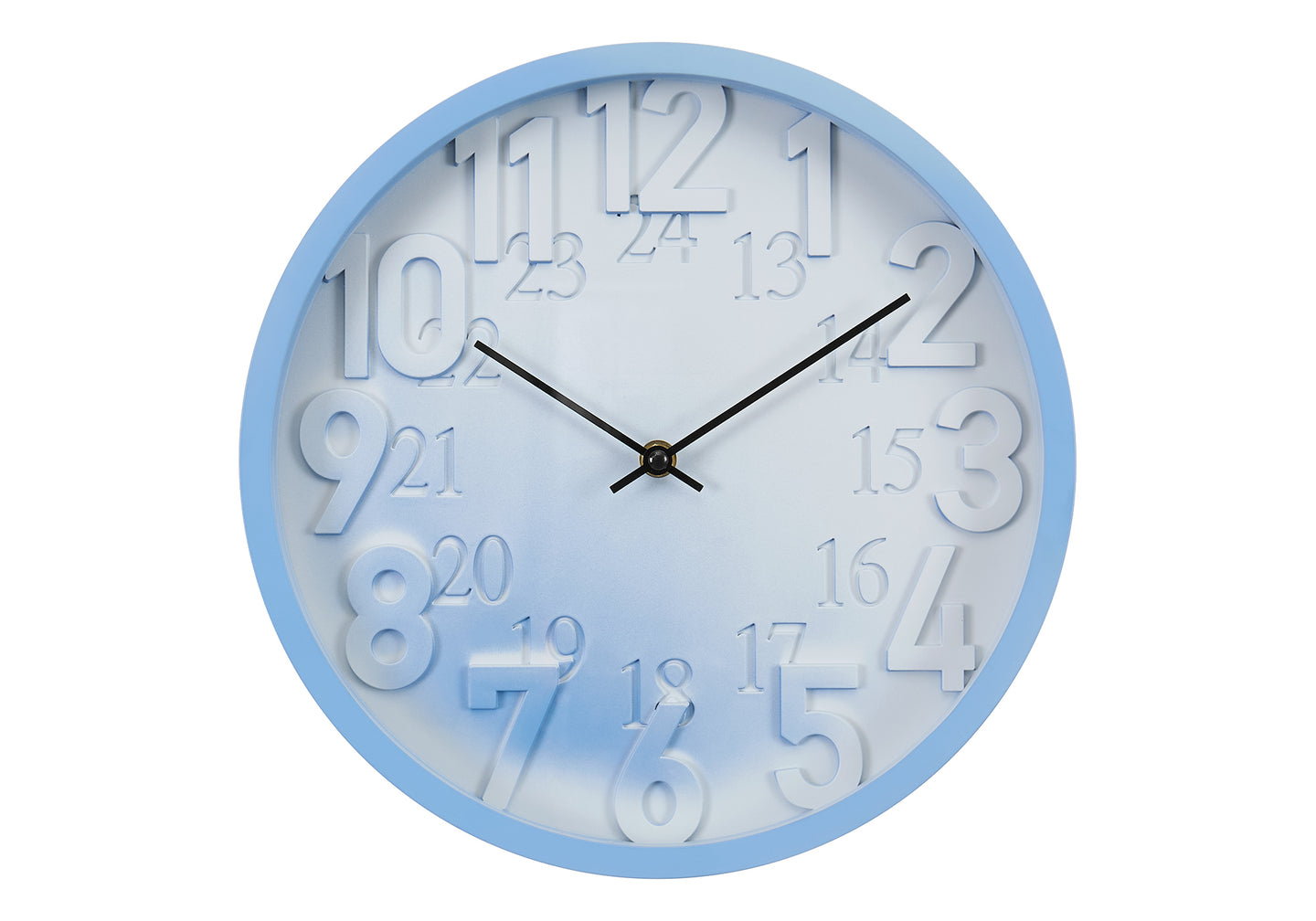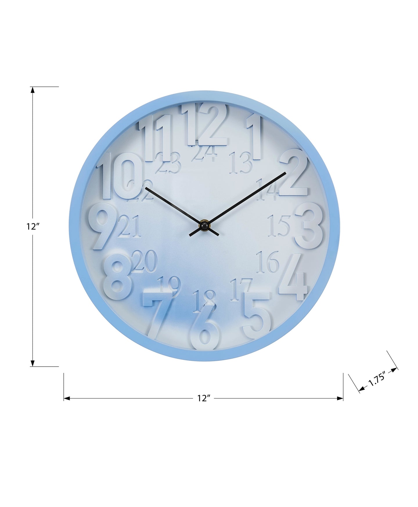 - This contemporary 12" round wall clock features a sleek light blue face and blue plastic frame, making it the ideal accent for any modern home decor or juvenile space.