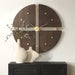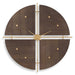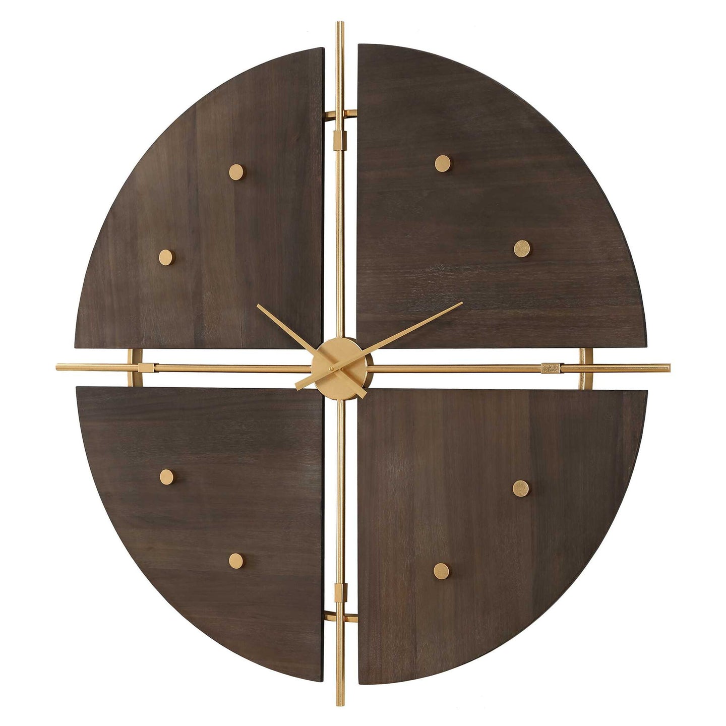 This Unique Clock Is A Harmonious Blend Of Form And Function, Divided Into Four Seamlessly Pieced Sections, Each Graced With A Luxurious Walnut Veneer. The Intersecting Iron Rods Add A Touch Of Sophistication, Finished In A Radiant Metallic Gold. Quartz Movement Ensures Accurate Timekeeping. Requires One "AA" Battery.