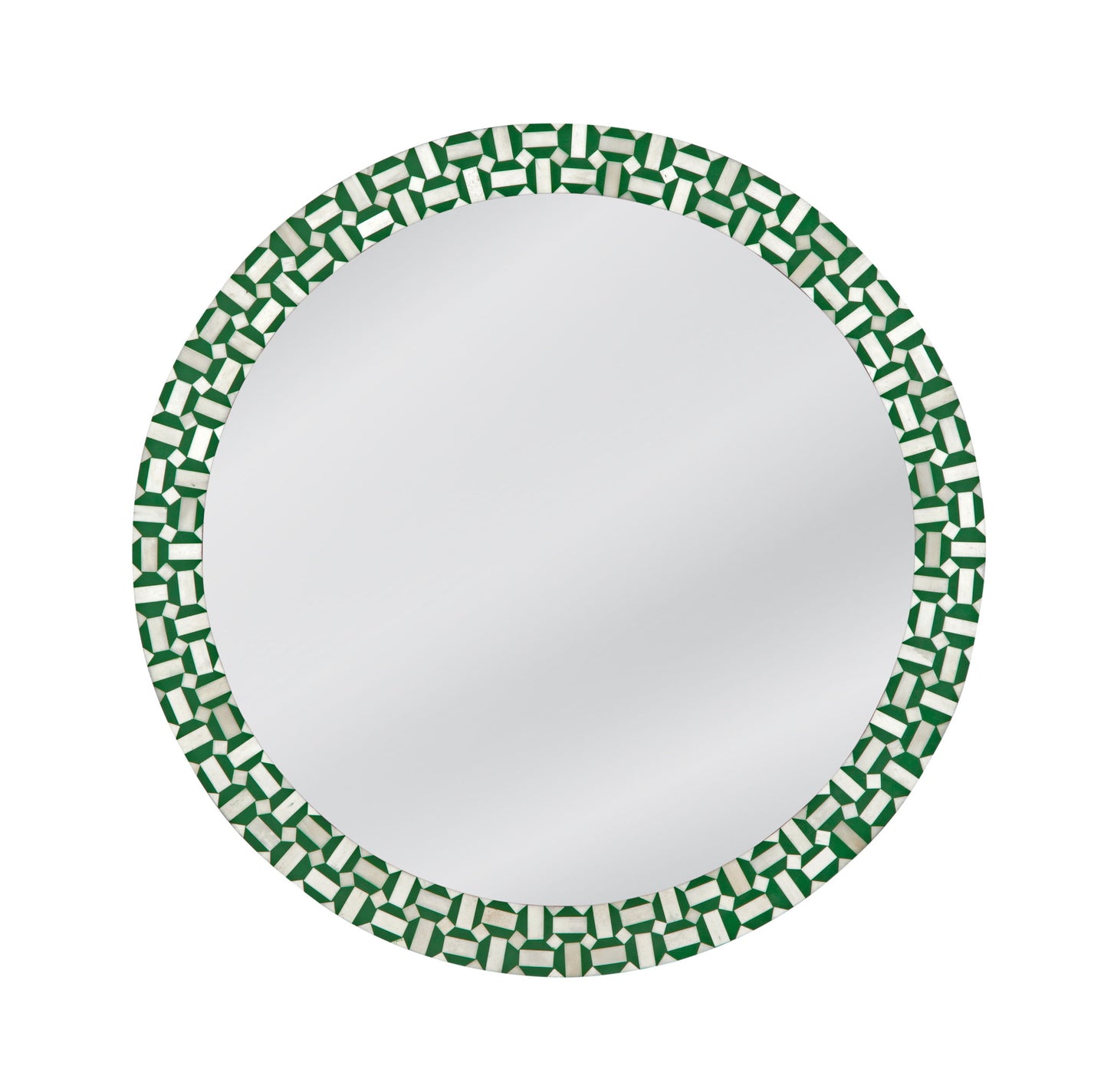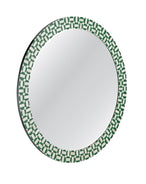 The Alanis Wall Mirror features a round silhouette with a geometric patterned frame. The frame showcases a vibrant green and cream bone inlay design. This mirror is constructed of bone and resin.