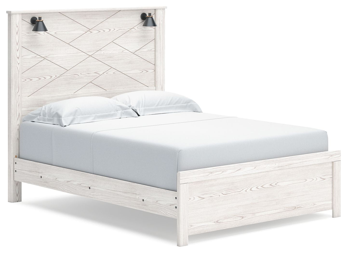 Cool, clean and casually modern. This panel bed’s rustic finish sets the tone for your calming sanctuary. Matte black sconce lights and an abstract design on the headboard bring a fresh look to the bed’s simply stunning profile.