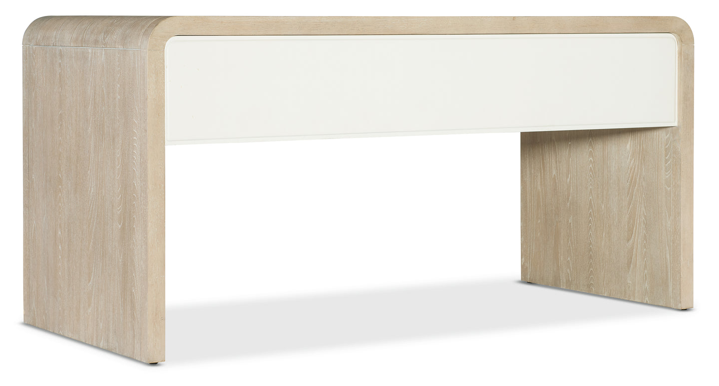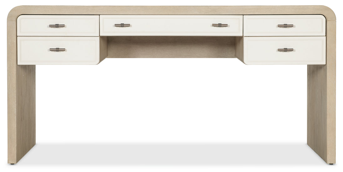 The Brixton Home Office Collection is a thoughtfully designed trio featuring elegant, curved waterfall silhouettes that give the collection a sleek and contemporary aesthetic. The two-tone finish pairs soft, elm veneers in a pebble hue with door and drawer fronts in a contrasting ivory with leathered texture.