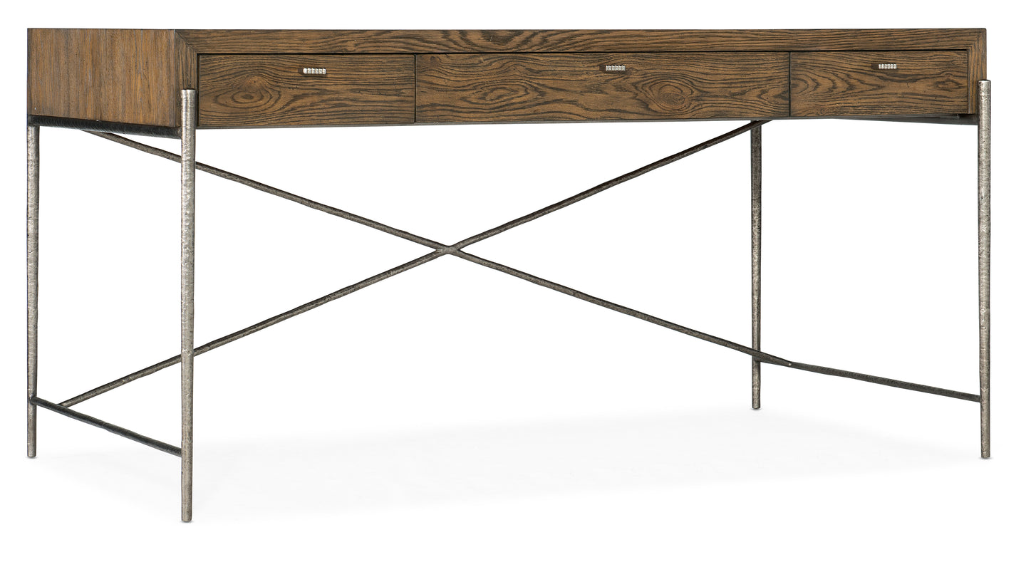 With exquisite scale and craftsmanship, the Chapman Writing Desk is crafted of White Oak Veneers in a warm brown Sorrel finish with thin forged pewter metal legs, an X-stretcher back and custom hand-hammered metal drawer pulls. Featuring 3 drawers, the left and right drawers have 2 removable dividers, and the center drawer has a drop-front for keyboard use and a cutout in the back of the drawer for wire management. There’s a pencil tray and writing slide for use in either left or right drawer.