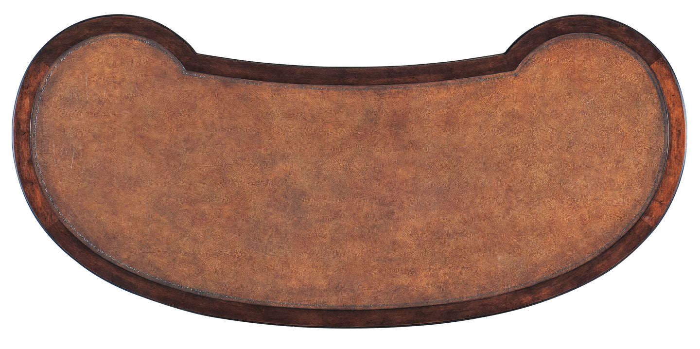 Inspired by the tropical craftsmanship of the West Indies and classic British and Dutch Colonial design periods, the Charleston Writing Desk has a timeless kidney shape, stretchers, rattan drawer fronts, intricately-carved leaf motifs on the legs and a robus leather writing surface top. Crafted of Cherry Veneers, Rattan and Resin, it is finished in the deep, rich Maraschino Cherry. There are five drawers. The left and right top drawers have one removable partition, one writing slide and pencil tray for use in either drawer. The center drawer has a drop-front for keyboard use. Antique bronze round knobs and ring-pull hardware add the finishing touch.