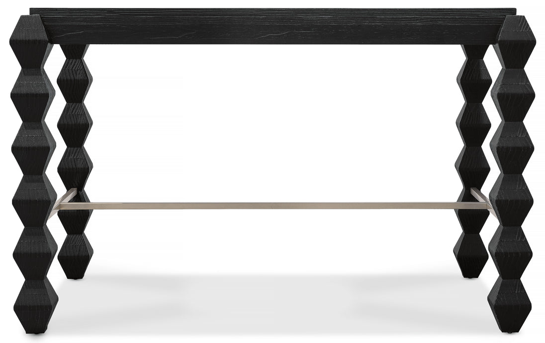 A unique piece in the collection, the Xaden Gathering Desk is distinguished by its Charred Black finish, achieved using the ancient Japanese technique of Shou Sugi Ban, which mimics the look of burnt wood. The desk features sculpted legs and a metal crossbar stretcher in pewter finish for additional support and style. With distressing details such as sandblasting, wormholes, and rock distressing, this desk offers a rugged, modern look perfect for creative spaces.