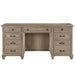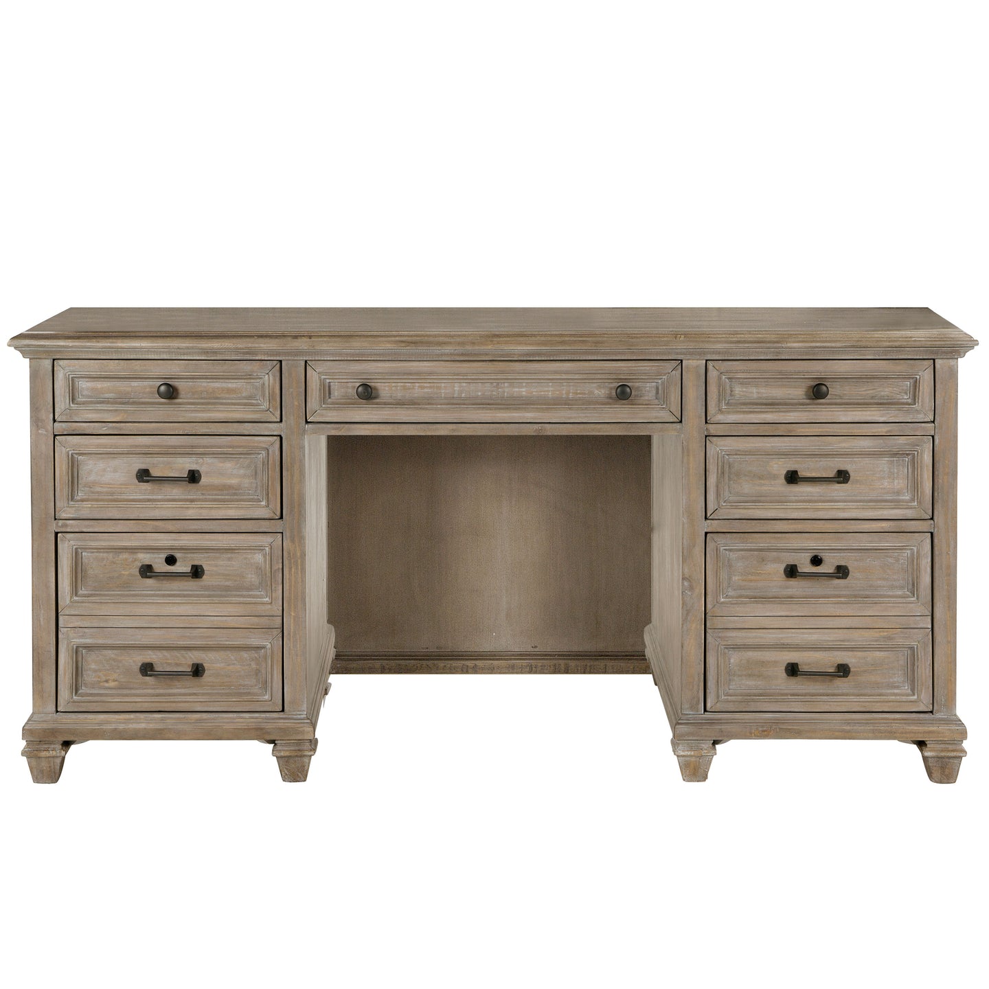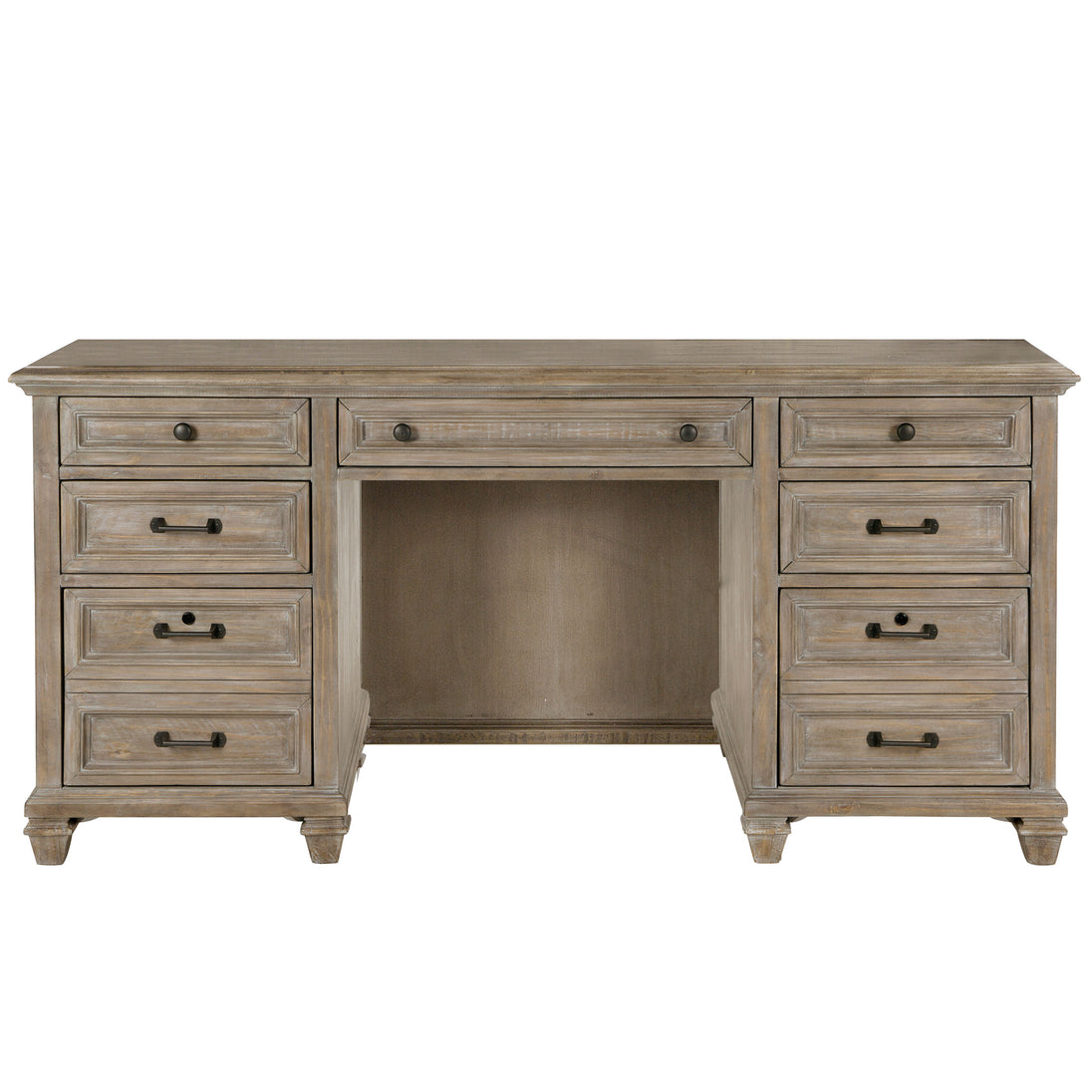 Seeking refined design and casual and rustic appeal in simply useful office pieces? Lancaster, crafted of Pine solids with handsome beaded panels in an updated Dovetail Grey finish and by Weathered Bronze pulls is the ideal solution. The desk; offered with optional hutch and lateral file have overhung tops and bead frame drawers with nicely shaped turned legs at the base. Crisp and updated, the open writing desk features a triangular open base with handsome cross supports that is repeated in the open bookcase while a glass door bookcase and fully upholstered swivel chair will support endless hours of productive home based work for any relaxed setting.