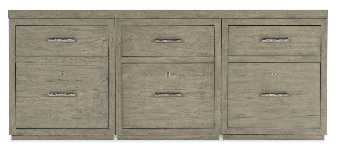 With a rustic weathered finish and clean modern lines, the Linville Falls Credenza includes a 72-inch top and three small files packed with function. Offering a total of 6 drawers, the top drawers are utility drawers and the bottom drawers are locking file drawers with pendaflex filing systems. Crafted of Oak Veneers, the credenza is finished in Mink, a soft smoked gray, and accented with textured metal bar pulls in an antique pewter finish.