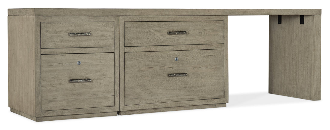 Capturing the essence of nature’s organic color palette on a clean-lined, simple silhouette, the Linville Falls Desk fuels inspiration with streamlined organization. Crafted of Oak Veneers with a soft smoked gray Mink finish, the expansive 96-inch wide top has a functional base including a small file on the end, a lateral file in the center and a leg end panel. Altogether, there are 4 drawers, with the top drawers serving as utility drawers and the lower drawers having a locking file with pendaflex filing system. The desk is fully finished on the back so it can be floated in a room.