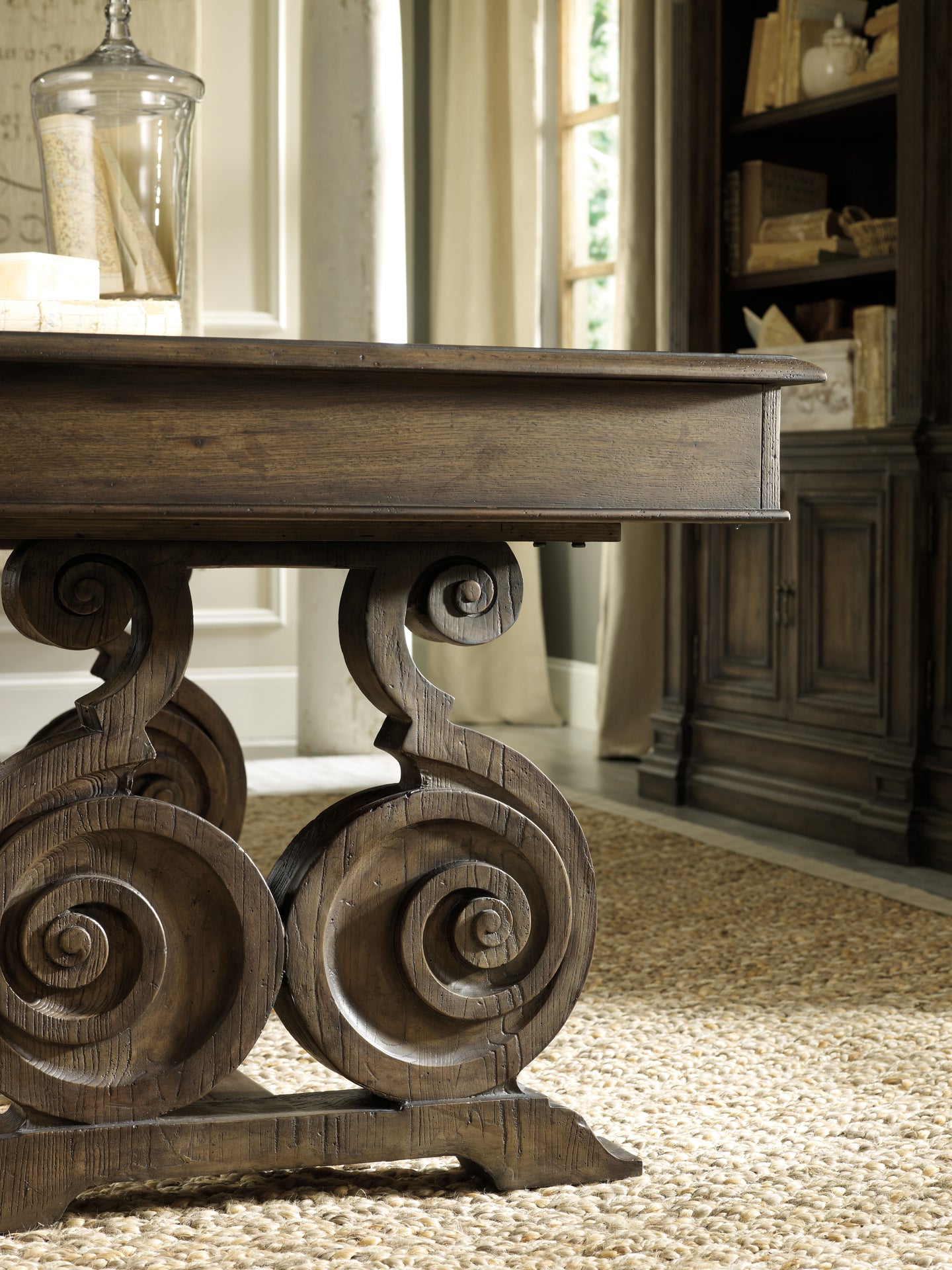 The groundbreaking Rhapsody Collection brings together classic design elements, grand scale, and a relaxed rustic finish to create an impassioned marriage of casual opulence. Exuberant scale and serpentine shapes infuse the pieces with emotion, while timeless motifs like scrolls, rope twist molding, the acanthus leaf and fleur de lis anchor Rhapsody in old world charm. Building on the grand scale and classic European design is the defining element of the collection: a walnut-colored finish inspired by the natural yet rustic nature of reclaimed woods in beautiful patinas.