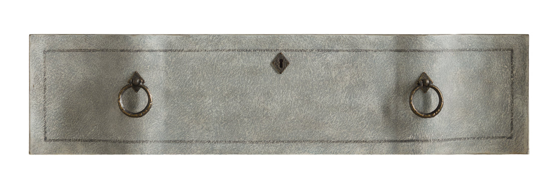 - Finition : Effet délavé, un jeu de bleu, de blanc et de gris sur une surface finement texturée. La quincaillerie est en métal foncé avec des reflets dorés.