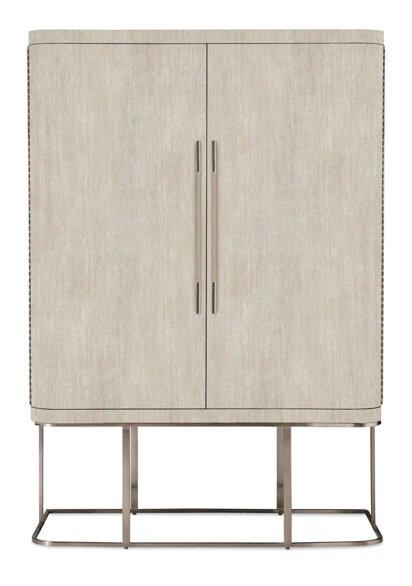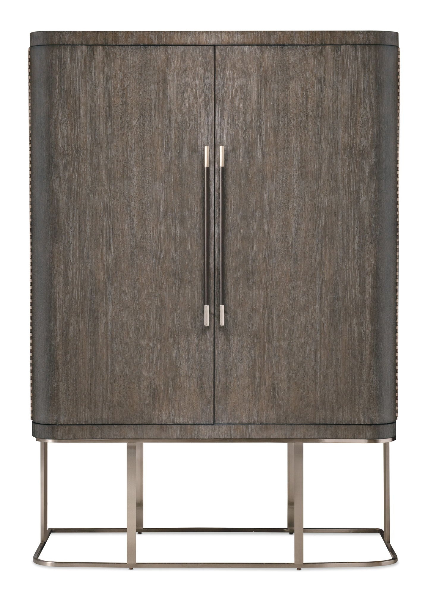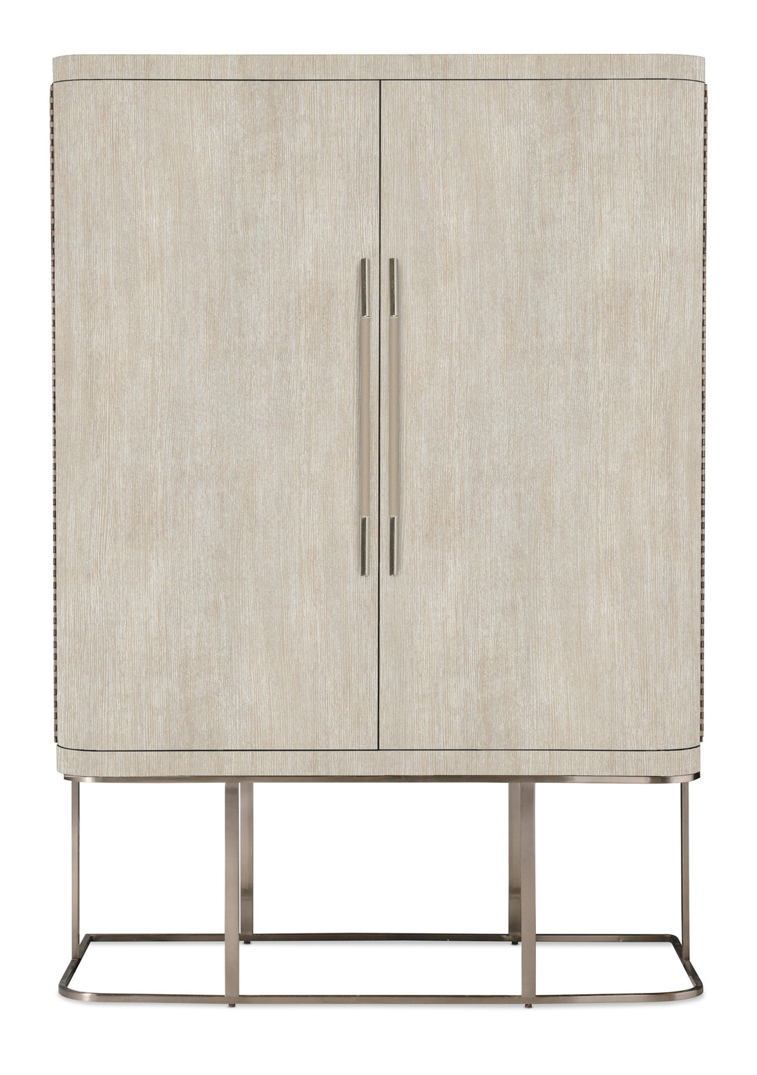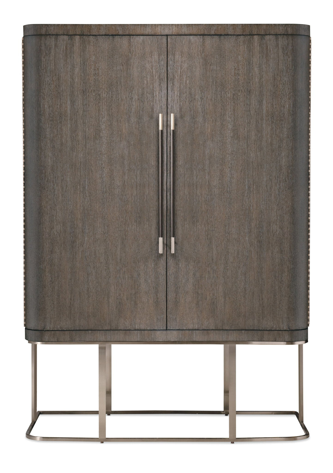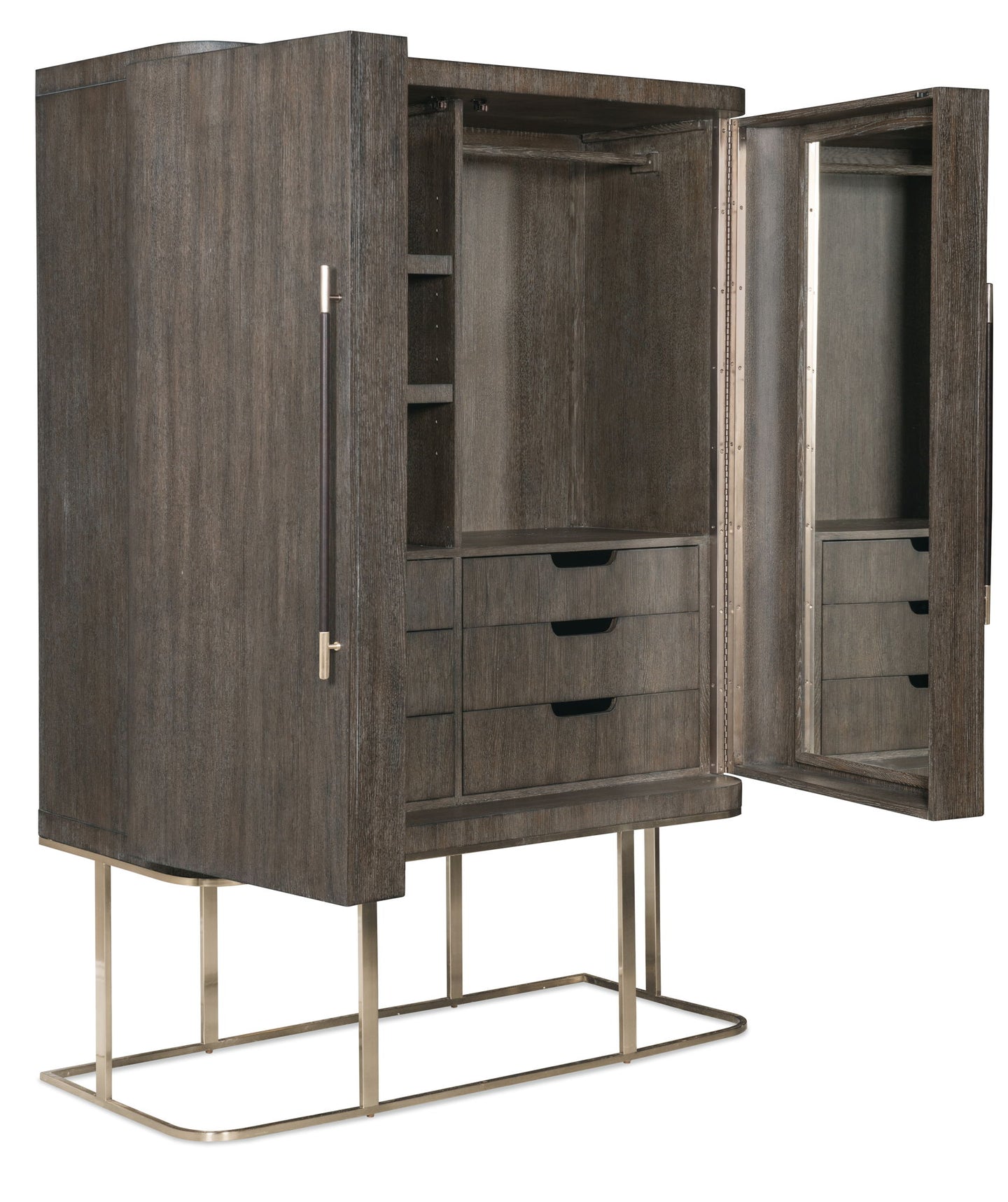 Architectural and timeless with a luxe mixture of materials, the Modern Mood Wardrobe is a statement piece. The shaped metal base gives the cabinet a floating appearance. Crafted with Oak Veneers, the wardrobe is finished in a serene Diamond color and has two large wood doors with piano hinges and mirror glass on the back of the right-side door. Behind the right-side doors are two adjustable shelves. Features include six self-closing drawers, a removable clothing rod and jewelry storage behind the left-side doors that includes 26 hooks, three felt-lined trays and one removable drop-in jewelry tray with four padded rows for rings.