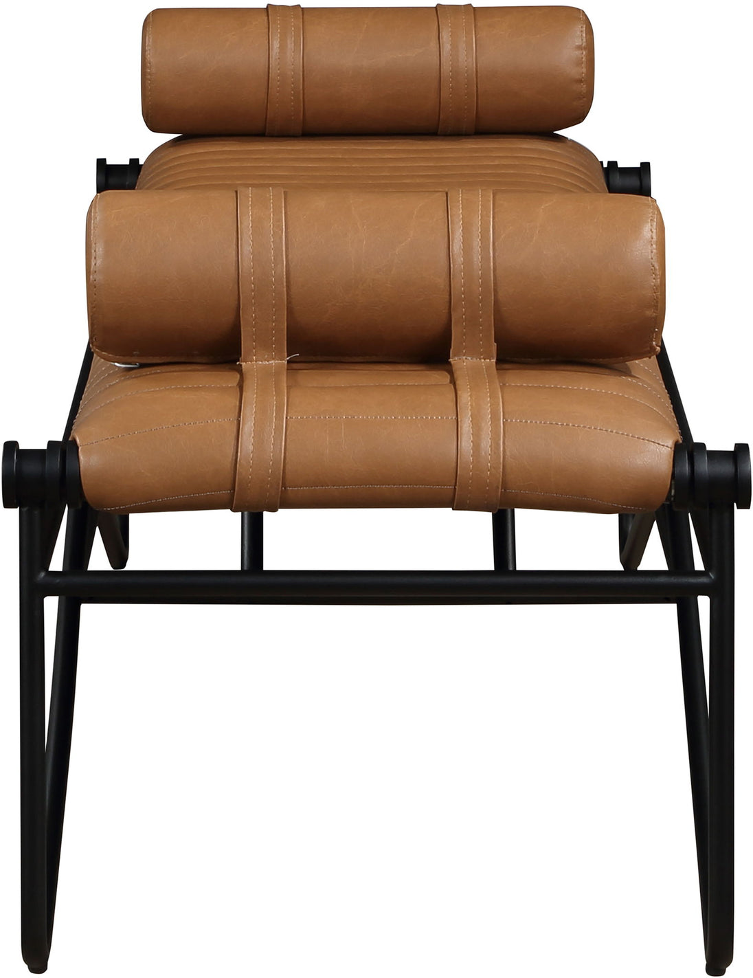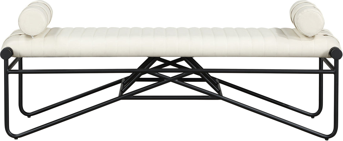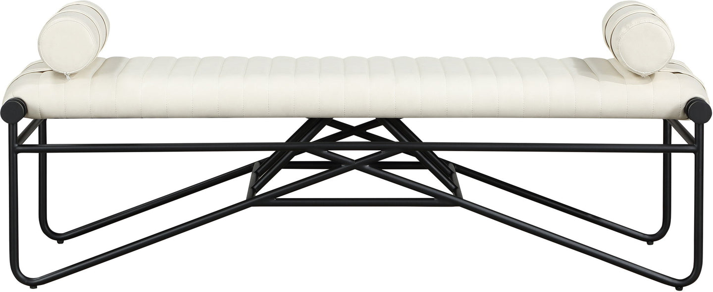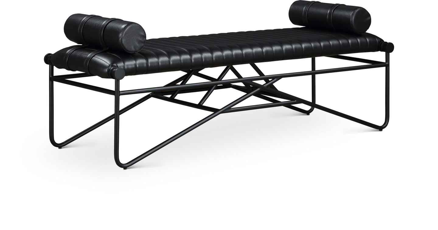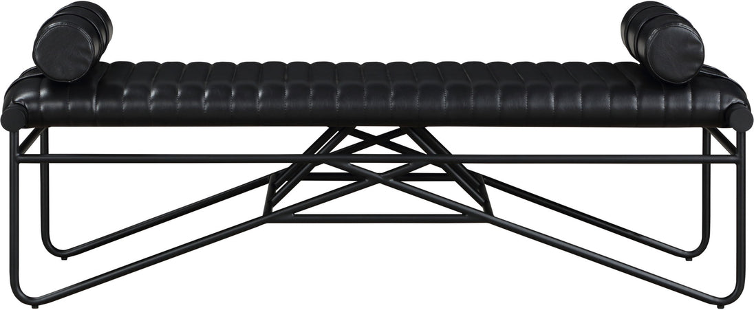 Elevate your space effortlessly with this Gatsby Vegan Leather Bench. Swathed in soft faux leather and anchored by a matte black iron metal frame, it boasts a contemporary design that's both sleek and stylish. The included rolled pillows give this bench an upscale yet comfortable look. Whether gracing your entryway with a touch of elegance or providing a chic accent at the foot of your bed, this versatile piece is sure to impress. Upgrade your home decor with this lovely vegan leather bench to give any space a touch of sophistication.