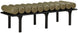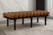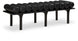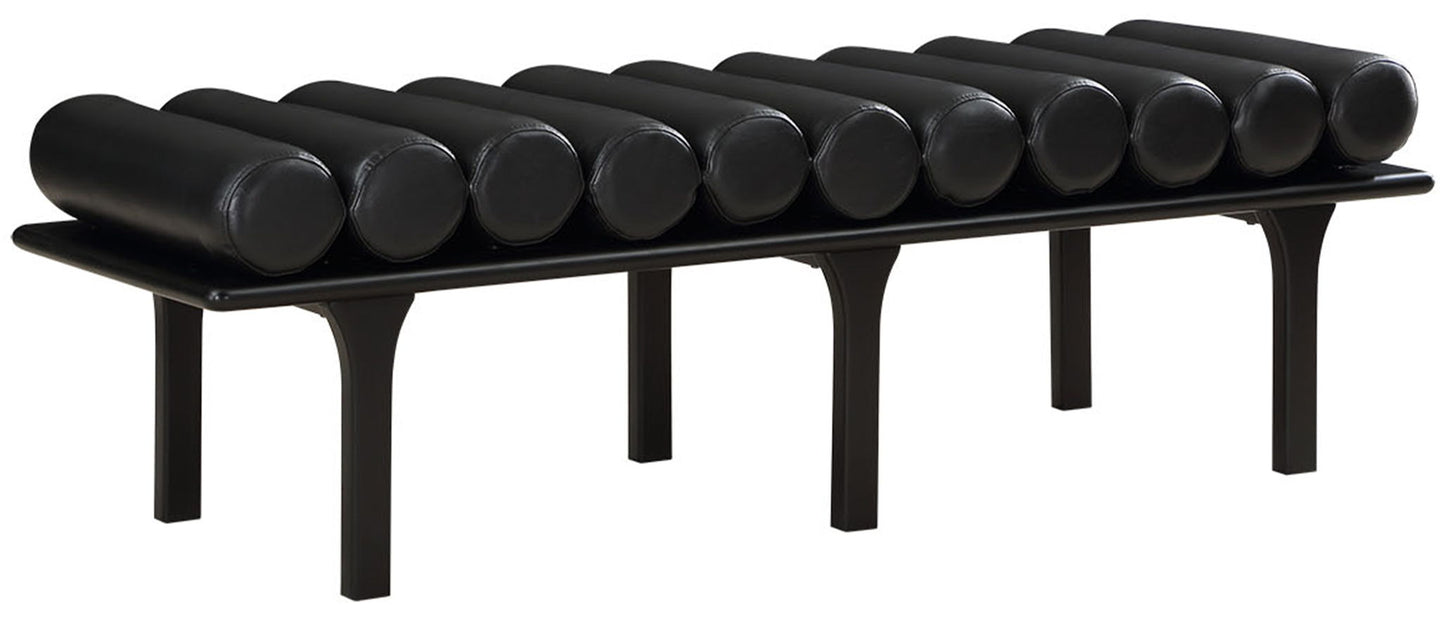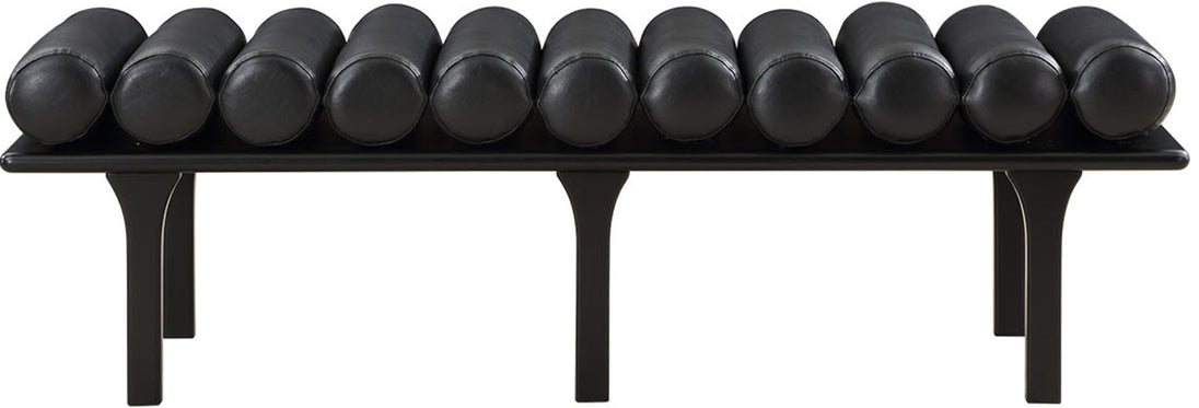 Outfit your foyer, bedroom, dressing room or other area of the home with this handsome Landon vegan leather bench. A rolled vegan leather seat upholstered in vegan leather gives this uniquely designed bench the luxe look of leather without the maintenance requirements. Built to last, this art-deco-inspired bench has a solid oak base finished in sleek black for a beautiful, resort feel in whatever room you wish to use it in.